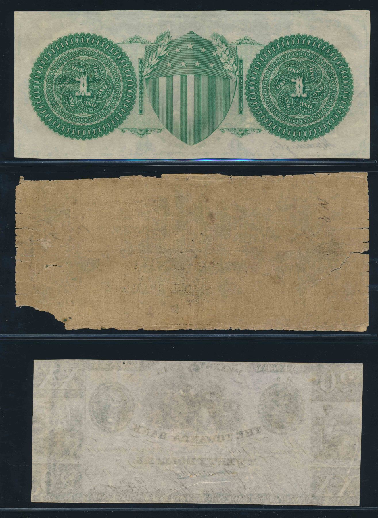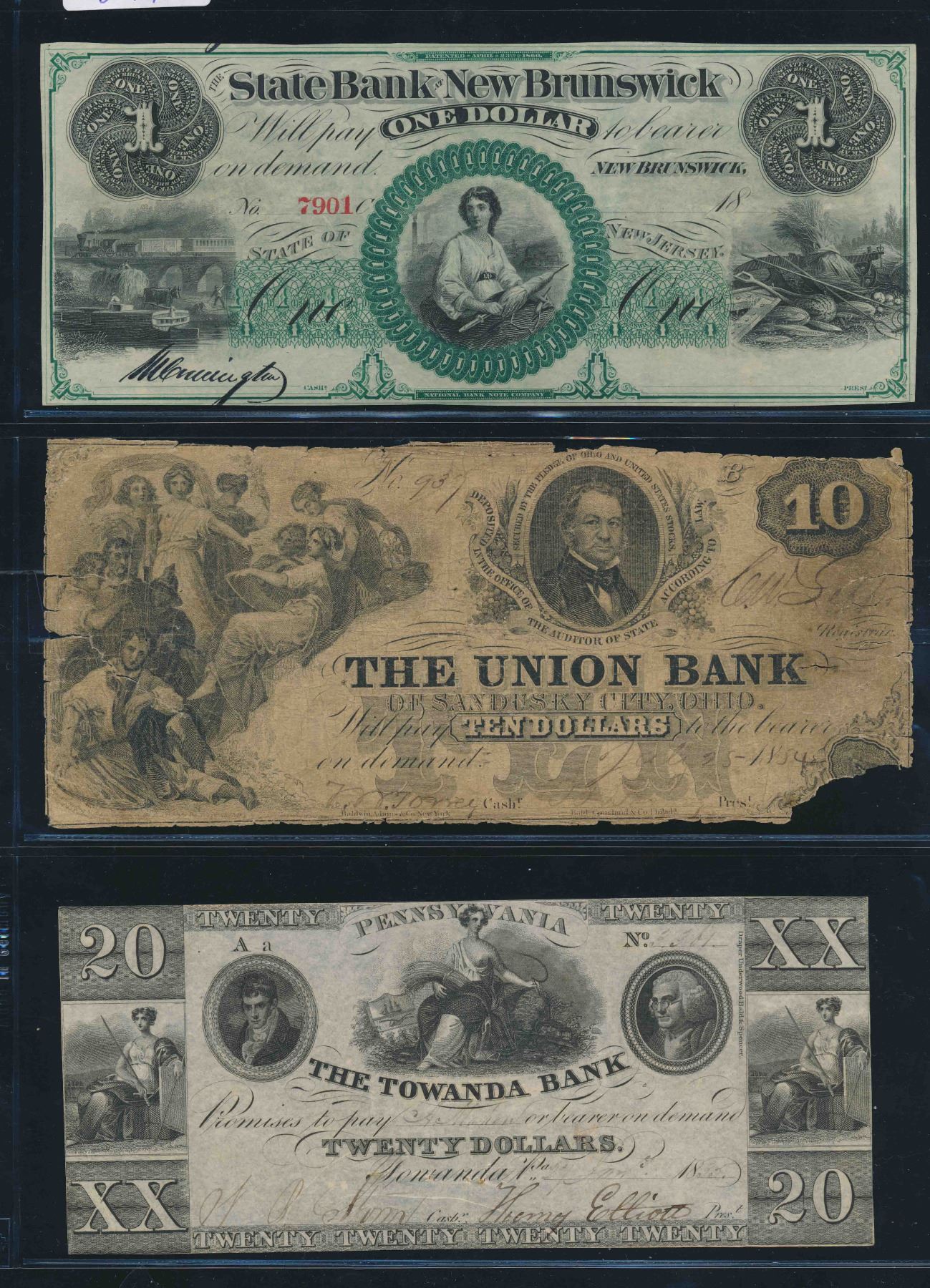 Lot of Three - State Bank of New Brunswick, New Jersey $1 Remainder 18--. AU ; Towanda Bank, Pennsylvania $20 1835 AU+, ; Union Bank $10 Sandursky City, Ohio Poor