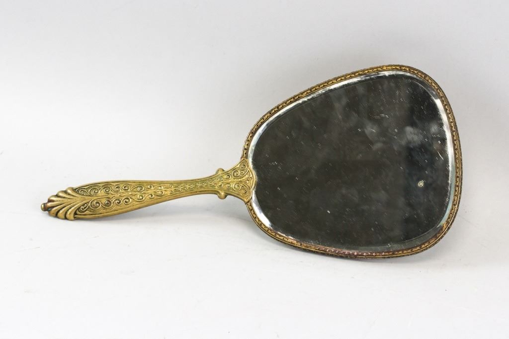Lot of three (3) European mirrors. Gold-colored. Two hand mirrors and one mirror with stand. 18 x 13 cm, 408 g (total).