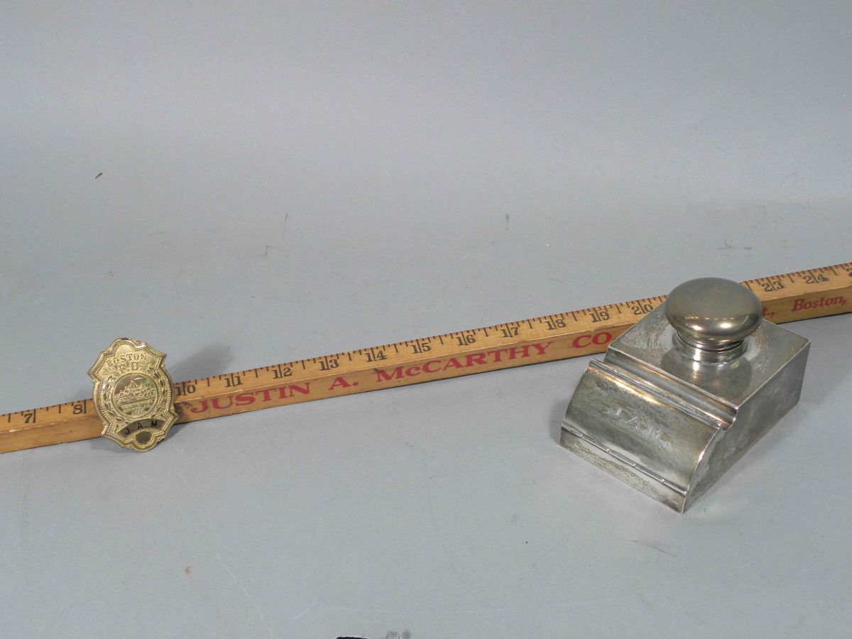 Lot of Three Fire Items including a Silver inkwell presented by Box 52 Association, 1914 an Appreciation and monogram JAM. Boston Fire Department Badge, J.A.M. and Advertising yardstick for the Justin A. Mc Carthy Co. Fire Hose and Fire Fighting Equipment.