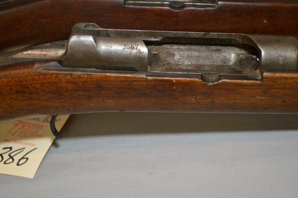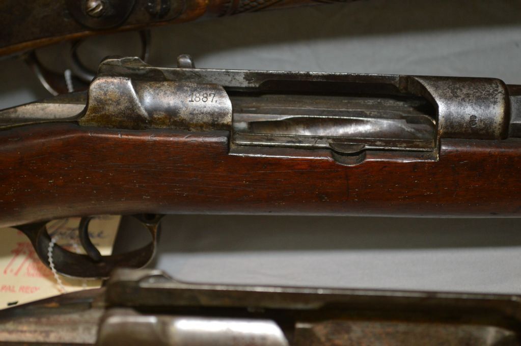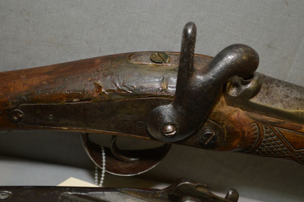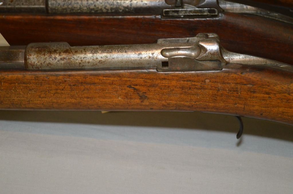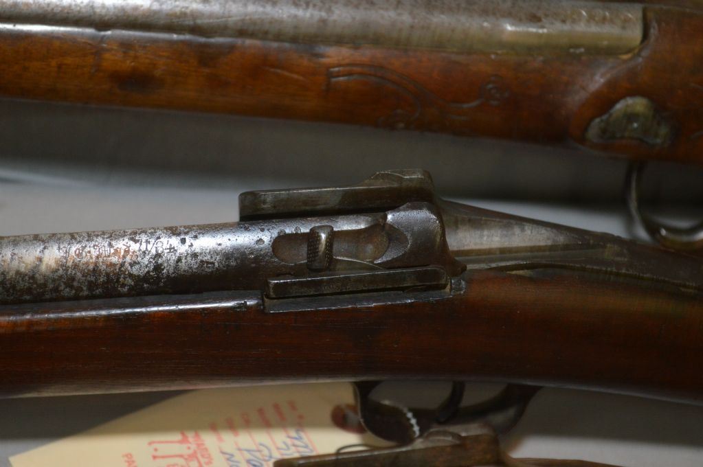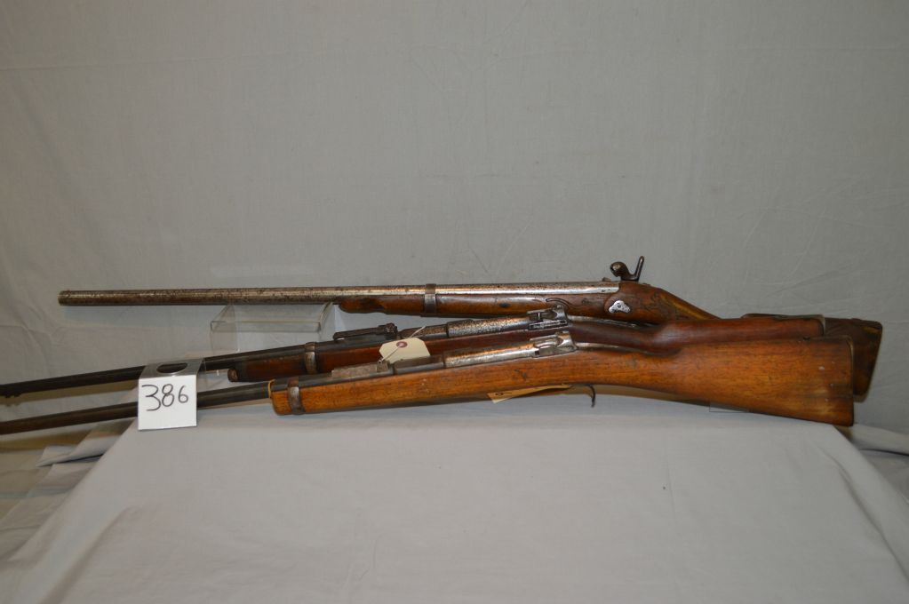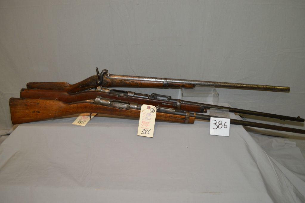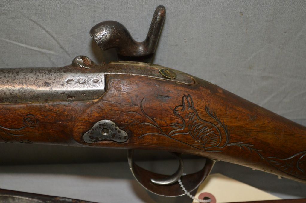 Lot of Three Firearms : Mauser Model 71/84 .11 MM Mauser cal Rifle Parts ONLY [ no bolt, etc (195) Ser # 9880 - Danzig Mauser Mod 71/84 Rifle [ parts, no bolt ( 196) ] SEr # 5470 - Ardennes Charleville .12 Bore Percussion Shotgun [ hand carved with scene of dog & rabbit, etc. (193 ) ] Ser # Nil