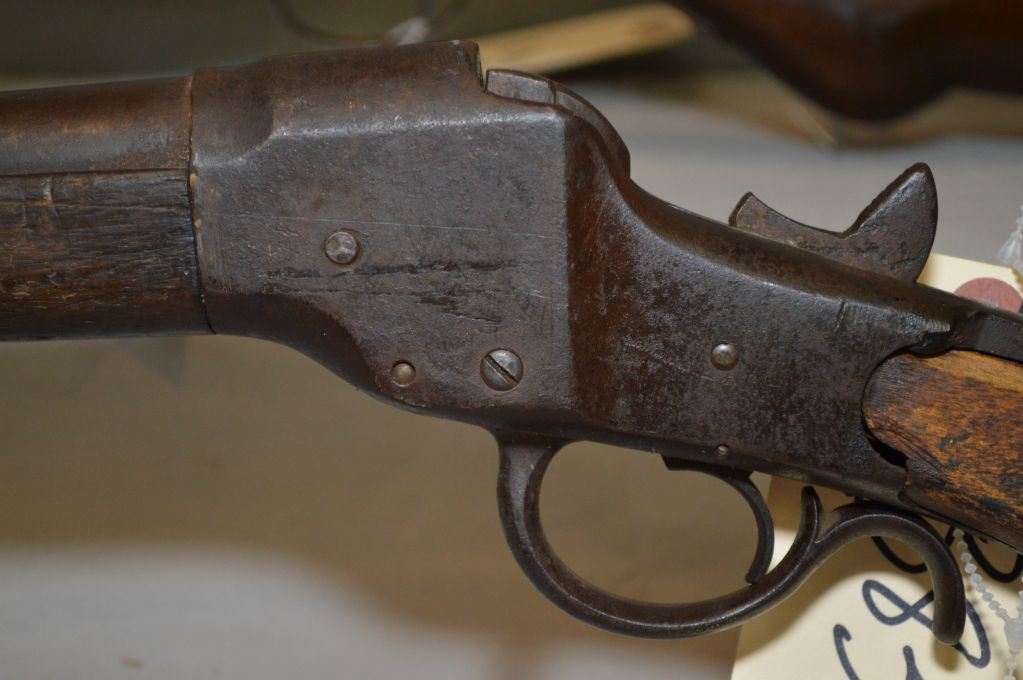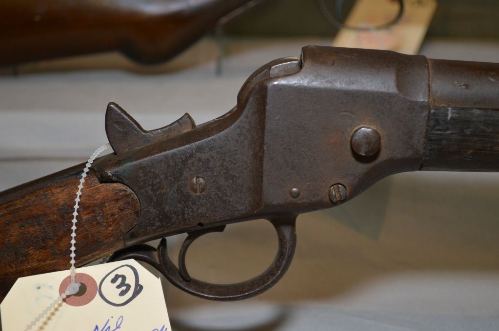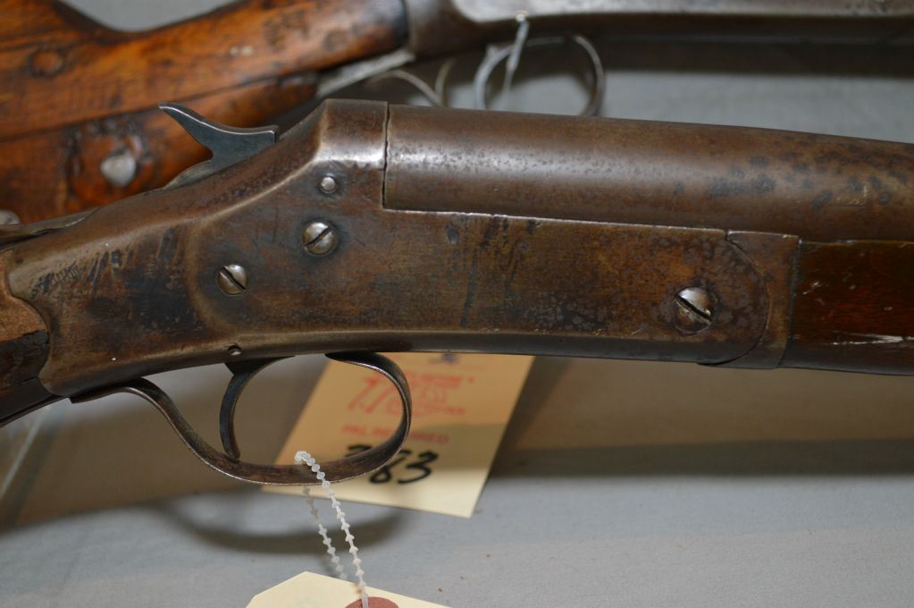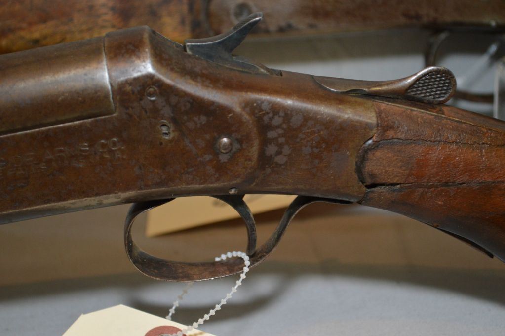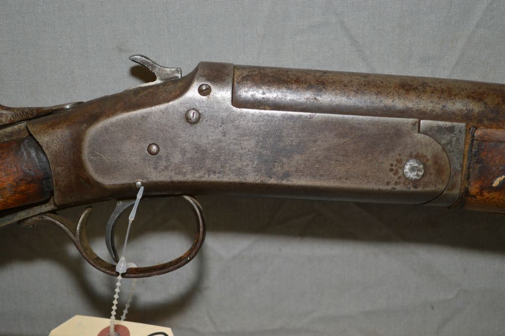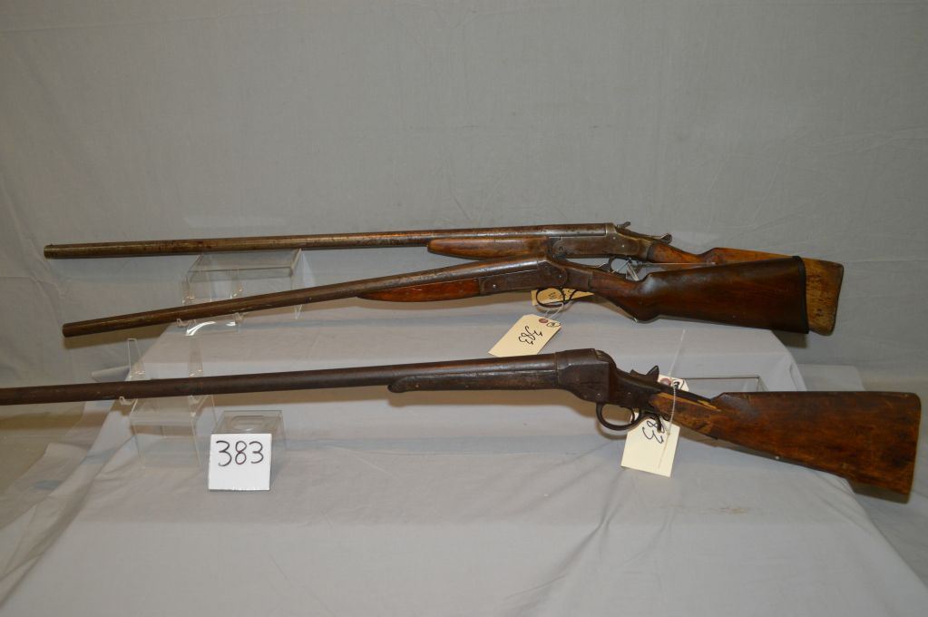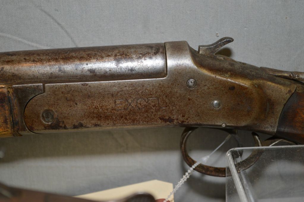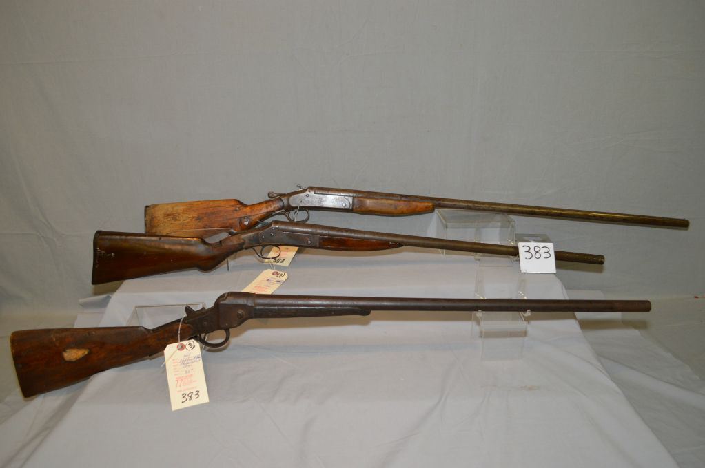 Lot of Three Firearms ( Poor Condition ) : Excel Single Shot .12 Ga Shotgun w/36" bbl [ blue turned brown, cracked & repaired stock, poor (180) ] Ser # 52287 - Hopkins & Allen .12 Ga Falling Block Rifle w/ 30" bbl [ blue finish turned brown, home made butt stock, original forend, poor, (192) ] Ser # Nil - Riverside Arms Model Single Barrel .12 Ga Shotgun w/ 28 1/2" bbl [ blue finish turned brown, stock broken & partly repaired at wrist, poor, ( 90 ) ] Ser # Nil