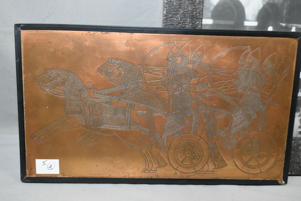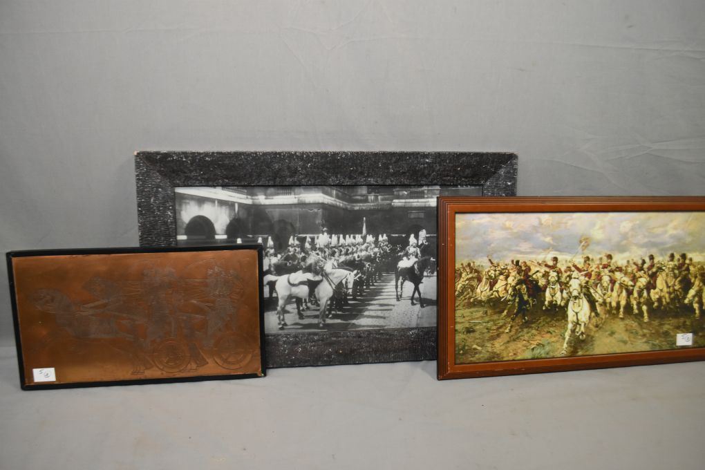 Lot of Three Framed Pictures : Black & White Photo " Buckingham Palace & Guards" - Color Print " Soldiers charging on Horse Back" - Copper Tooled PIcture of Egyptian Era Archers driving three horse chariots