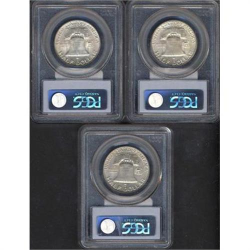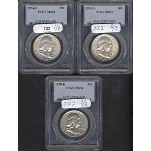 <b>Lot of Three Franklin Half Dollars.</b> Includes: 1954-D PCGS MS64, 1954-S PCGS MS65, and 1958-D PCGS MS64. Lot of 3 coins. <i>
