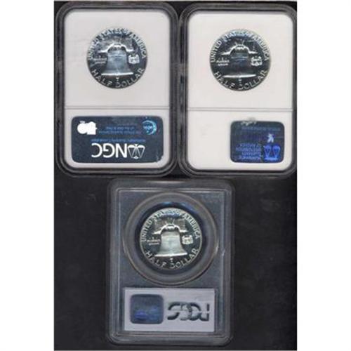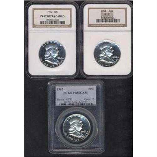 <b>Lot of Three Franklin Half Dollars.</b> Includes: 1958 NGC PF67, 1962 NGC PF67 Ultra Cameo, and 1962 PCGS PR66 Cameo. Lot of 3 coins.