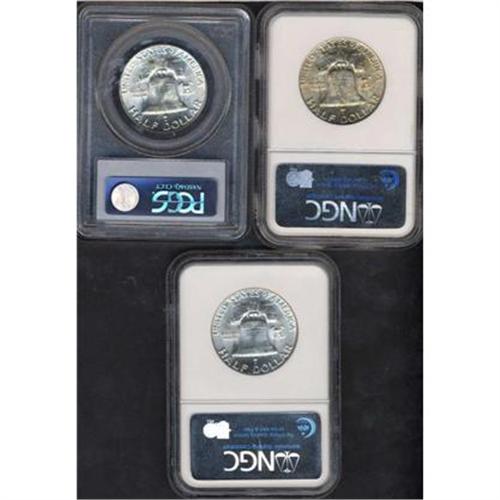 <b>Lot of Three Franklin Half Dollars.</b> Includes: 1959 PCGS MS65FBL, 1959-D NGC MS64, and 1960 NGC MS64. Lot of 3 coins.