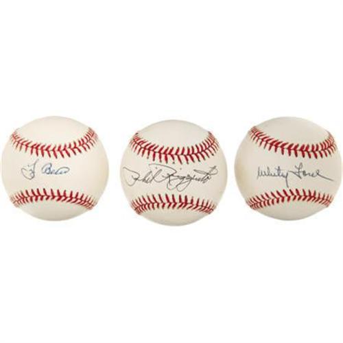 <B>Lot of Three HOF Single Signed Baseballs with Rizzuto/Berra/Ford.</B></I> What a beautiful collection of single signed baseballs! These three guys will forever be linked as NY Yankee brethren. Phil Rizzuto, who played his entire career as a Yankee, is probably best known as a team broadcaster for over thirty years. Clean signature on the sweet spot on an OAL ball in black ink. Yogi Berra and Whitey Ford were battery mates for many Yankee seasons. Both of these OAL baseballs were single signed by the HOF'ers in blue ink, clean and clear on the sweet spot. <I>LOA from PSA/DNA.</B></I><BR><BR><b>Shipping:</b> Balls, Pucks, etc., Small (<a target="_blank" href="http://www.heritageauctions.com/common/shipping.php">view shipping information</a>)