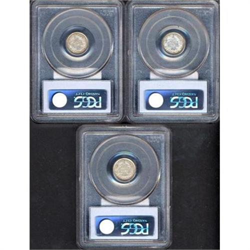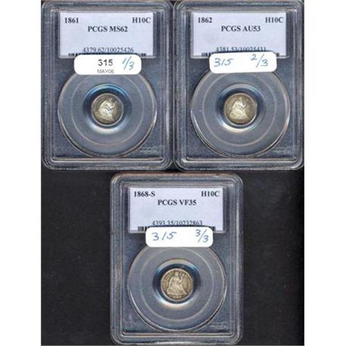 <b>Lot of Three Half Dimes: 1861, 1862 and 1868-S.</b> Includes: 1861 PCGS MS62, 1862 PCGS AU53, and 1868-S PCGS VF35. Lot of 3 coins. <i>
