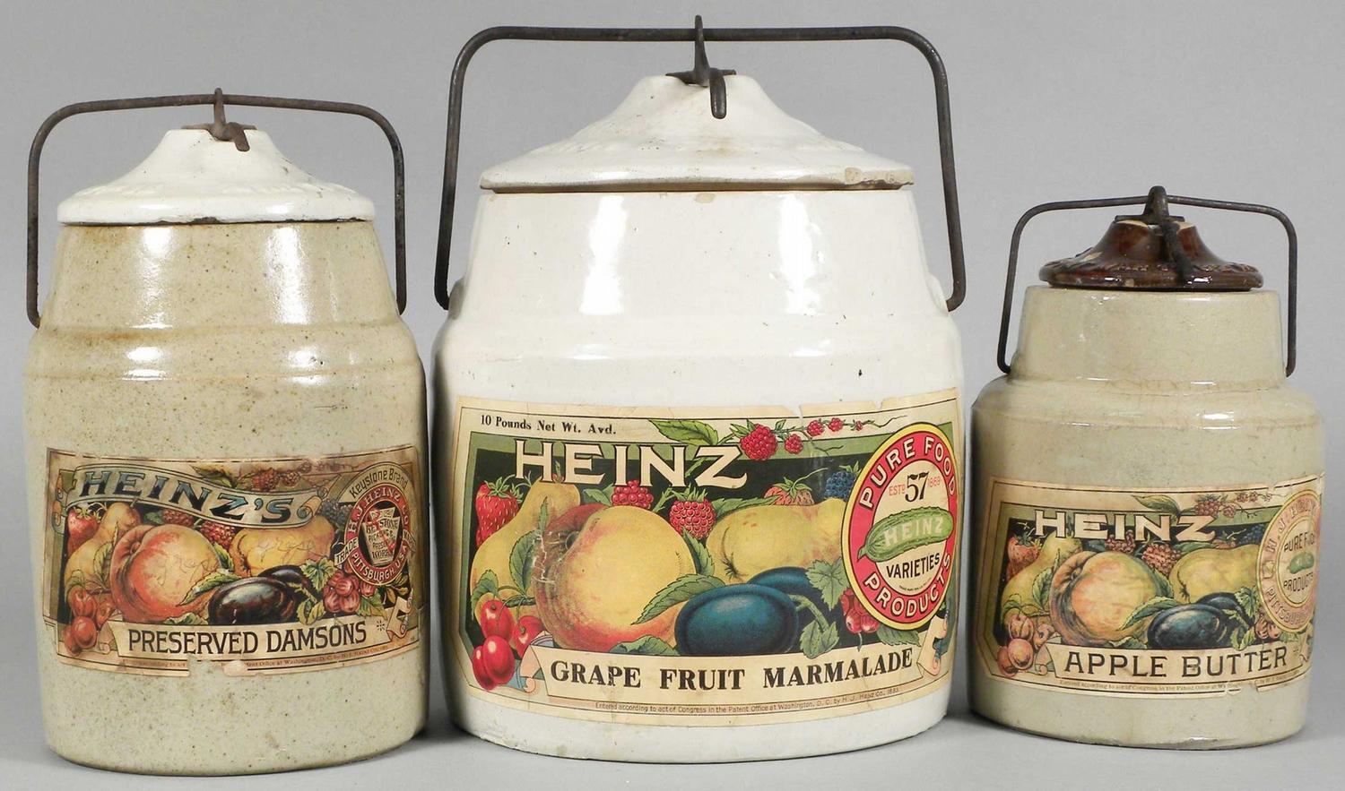 Lot of Three Heinz Crocks with paper labels including Preserved Damsons, Grape Fruit Marmalade and Apple Butter. Label in good/very good condition and some minor chips. Three sizes tallest measuring 10 inches tall.