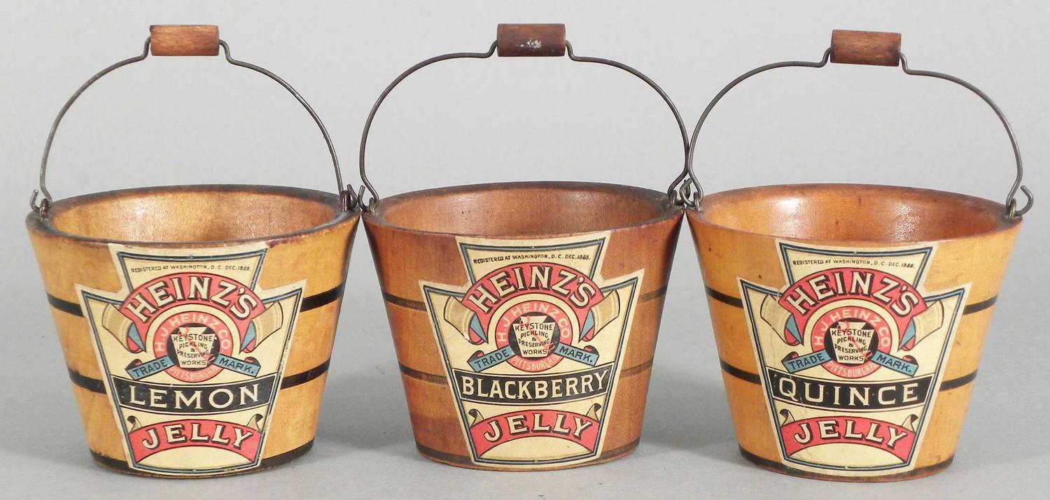 Lot of Three Heinz's Jelly Buckets with bales. Lemon, Blackberry and Quince. Original paper label, excellent condition. 3 inch diameter at top.