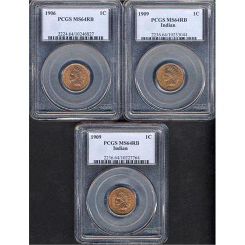 <b>Lot of Three Indian Head Cents: 1906 and two 1909.</b> Includes: 1906 PCGS MS64RB, 1909 Indian PCGS MS64RB (2 pieces). Lot of 3 coins. <i>