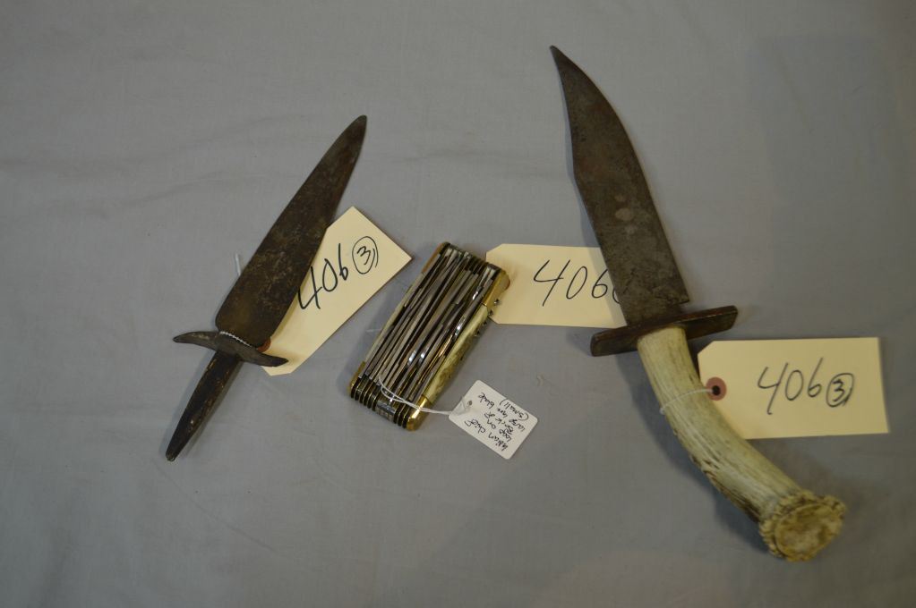 Lot of Three Items : Large Antique Bowie Style Knife w/ antler handle From The Pound Maker Saskatchewan Reserve w/ approx 9" blade, 16" overall length - Antique Speer head / knife blade approx. 11" overall - Italian Inox Indian Brand Rost Frei Multi Blade Knife w/stag hands