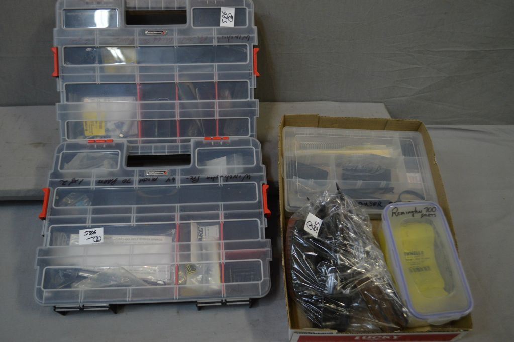 Lot of Three Items : Two Plastic Trays full of gun parts [ Winchesters Model 70, Pre 64, etc. ] Cardboard Tray : Mauser 98 Parts - Remington 700 parts - Shotgun in parts , etc. Great Lot !