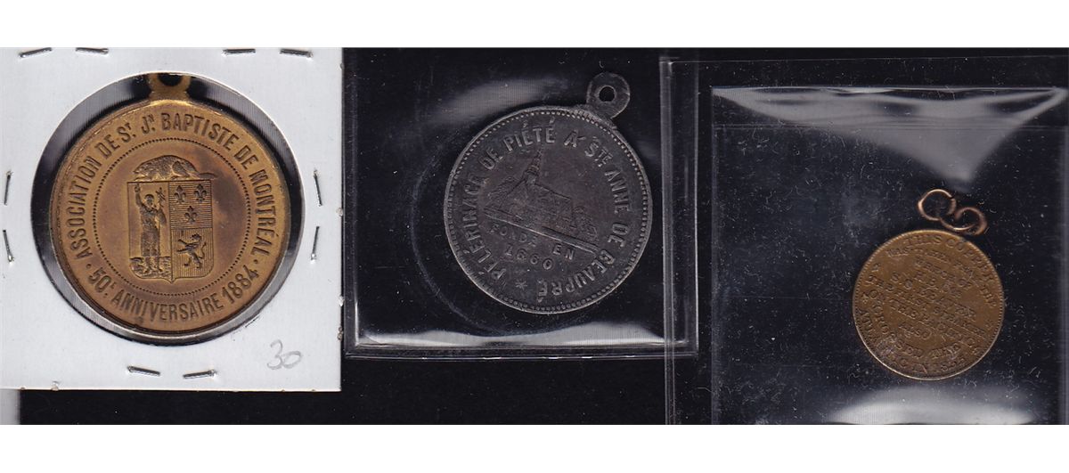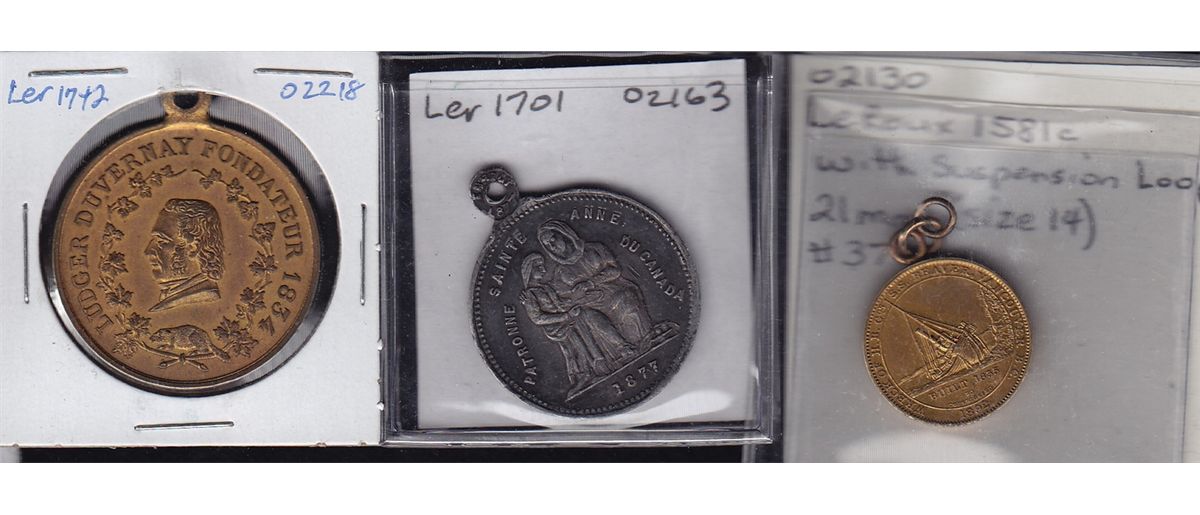Lot of Three Leroux Medals - 1 - Leroux 1581c Wreck of the Hudson Bay Co. Beaver. Brass, looped, UNC. 2 - Leroux 1701 St. Anne de Beaupre. WM, looped. EF. 3 - Leroux 1742 St. Jean Baptiste 1884. Brass, looped. AU. 3 Pcs.