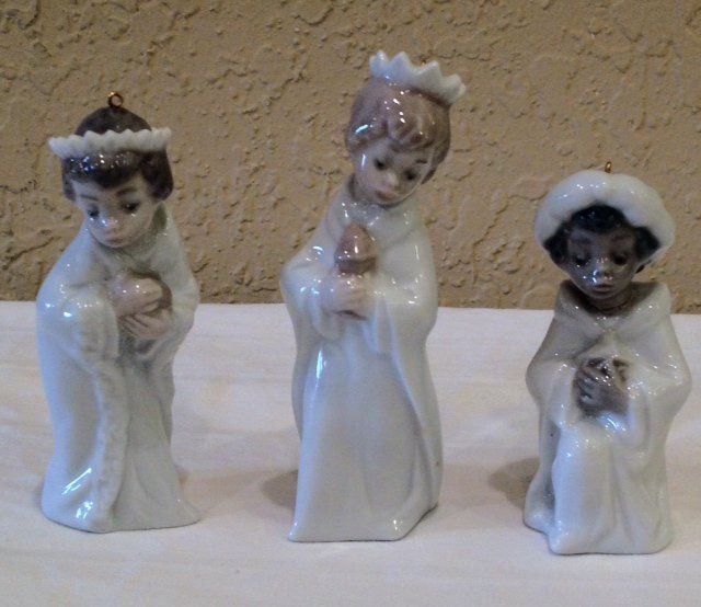 Lot of three Lladro figurines. Three kings holding gifts. 3.5"H x 1.5"W