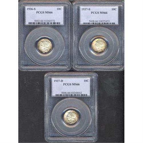 <b>Lot of Three Mercury Dimes.</b> Includes: 1936-S PCGS MS66, 1937-S PCGS MS66, and 1937-D PCGS MS66. Lot of 3 coins. <i>