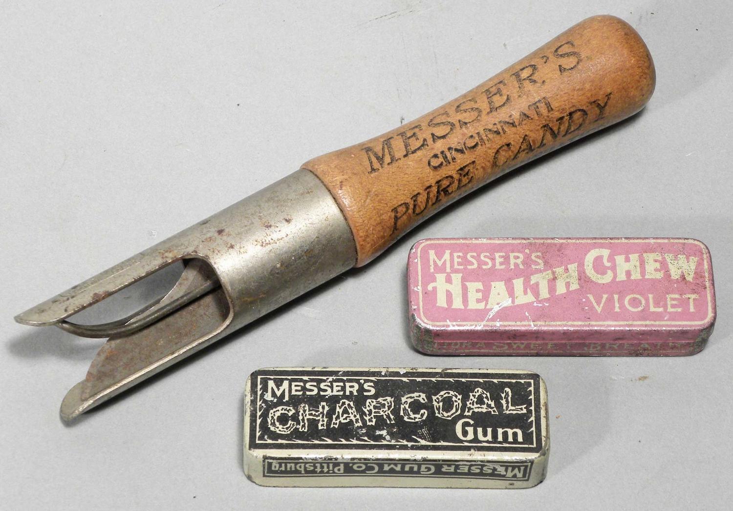 Lot of Three Messer's Candy Items including two gum boxes for Violet and Charcoal gum and tool. All in very good original condition. Tool measures 6 1/4 inches long.