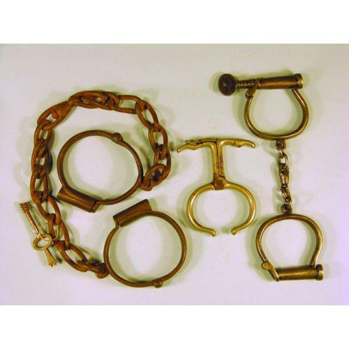 Three Restraints, including Plug Key Leg Irons, Phillips Nipper and British Darby, W.R.C. 1885. Various sizes and conditions, with keys.