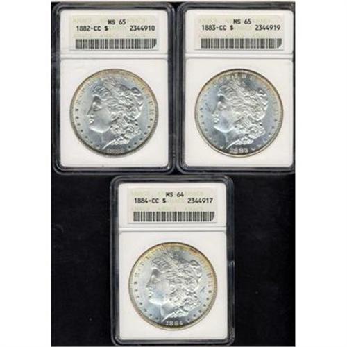 <b>Lot of Three Morgan Dollars.</b> Includes: 1882-CC ANACS MS65, 1883-CC ANACS MS65, and 1884-CC ANACS MS64. Lot of 3 coins.