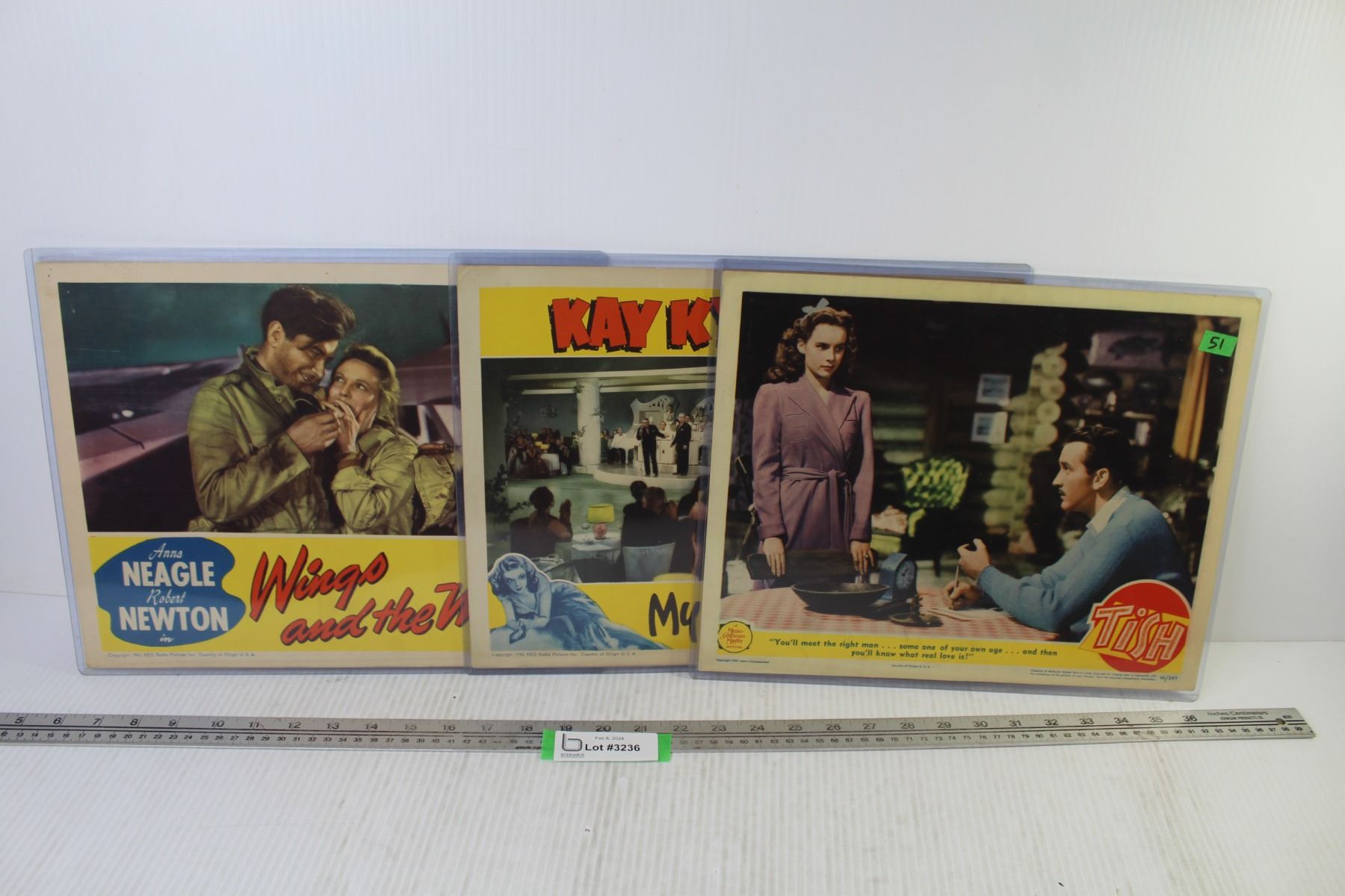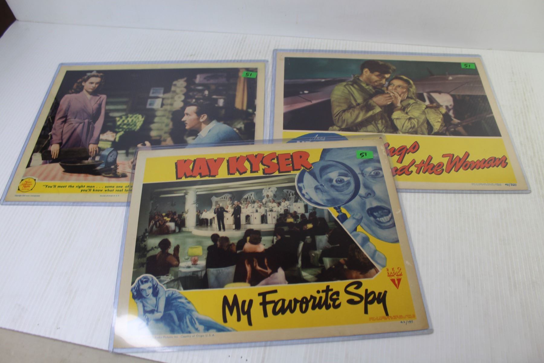Lot of Three Movie Lobby Cards From 1942 - Wings & The Woman - My Favorite Spy & Tish - (11" x 14" - Cards Are in Good Overall Condition)