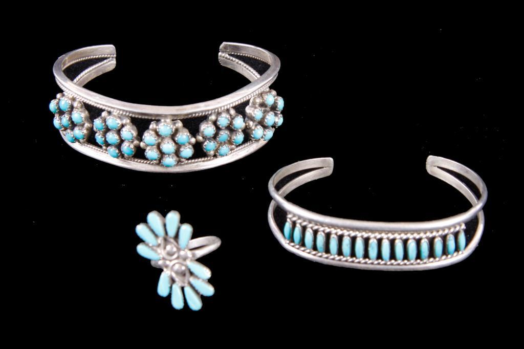 Lot of Three Native American Jewelry Items Including two turquoise cuff bracelets and a turquoise ri