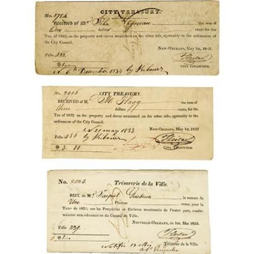 <B>Lot of Three New Orleans Slave Tax Documents</B></I>. Three partially printed slave tax documents, about 6.5” x 3.25” each, two in English, one in French, New Orleans, with dates ranging from 1833 and 1834. Each document is hand numbered, has the slave owner’s name on the front, and the number of slaves on which the tax is levied on the reverse. Apparently the tax rate per slave was levied at one dollar per slave. Each document has slightly toned with age, else they are in remarkably fine condition. <BR><BR><BR><b>Shipping:</b> Flat Material, Small (<a target="_blank" href="http://www.heritageauctions.com/common/shipping.php">view shipping information</a>)