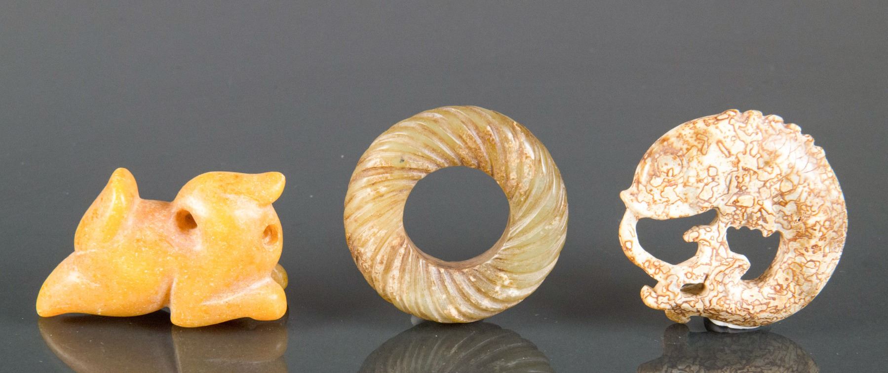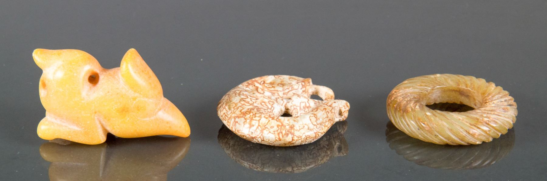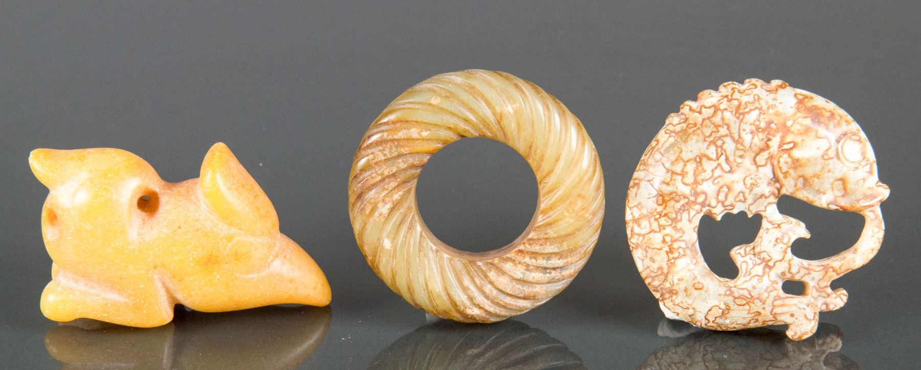 Lot of three (3) Chinese old hardstone carved pendants; featuring a circular form pendant, a carp form pendant and a bird form toggle; D: 5 cm (largest), 154 grams total