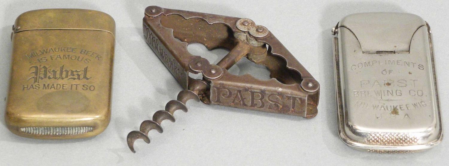 Lot of Three Pabst Blue Ribbon Beer items including two match safes and a cork screw. All in very good original condition.