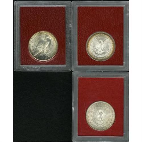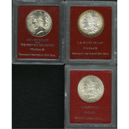 <B>Lot of Three Paramount Silver Dollars, One Ex: Redfield.</B></I> This silver dollar lot includes: <B>1897 MS65 Paramount (MS64)</B></I>, crisply struck with blue-green and orange peripheral toning, uncommonly attractive; <B>1902-O MS65 Paramount (MS63)</B></I>, pleasingly detailed with softly lustrous, lightly abraded golden-tan and cloud-gray surfaces; and a <B>1926-S MS65 Paramount (MS62)</B></I>, ex: Redfield, sharply struck with flashy luster and a number of light to moderate abrasions on the subtly gold-tinged surfaces.<BR><BR><B>Coin Engraver:</B> George T. Morgan<BR><BR><b>Shipping:</b> Coins & Currency (<a target="_blank" href="http://www.heritageauctions.com/common/shipping.php">view shipping information</a>)