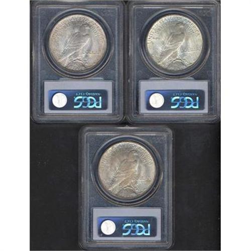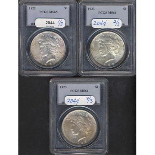 <b>Lot of Three Peace Dollars.</b> Includes: 1922 PCGS MS65 and 1923 PCGS MS64 (2 pcs.). Lot of 3 coins. <i>