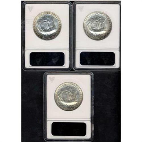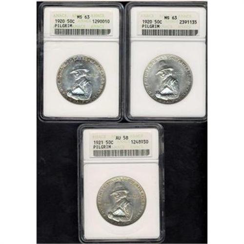 <b>Lot of Three Pilgrim Commemorative Half Dollars.</b> Includes: 1920 ANACS MS63 Pilgrim (2pcs) and 1921 ANACS AU58 Pilgrim. Lot of 3 coins.