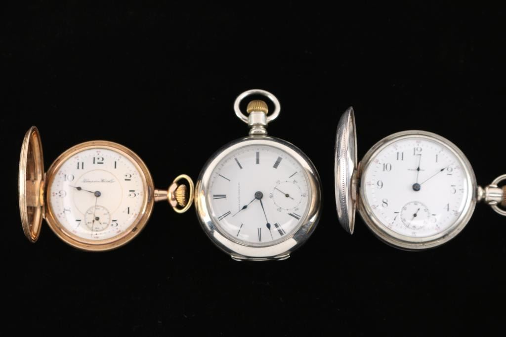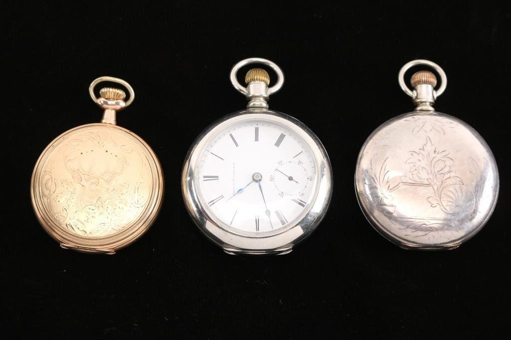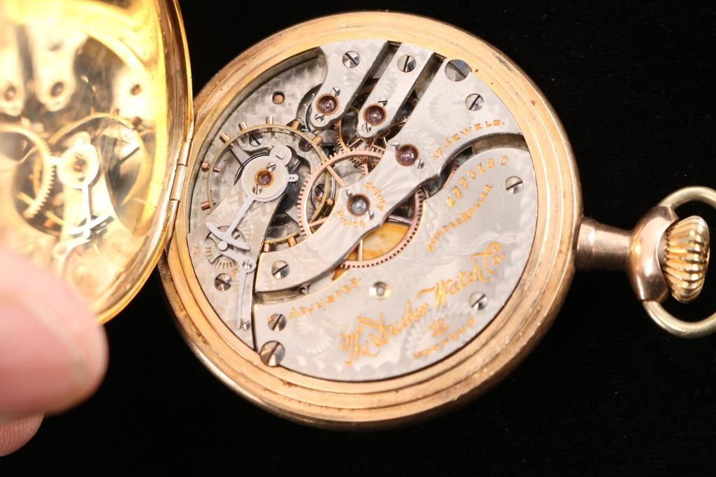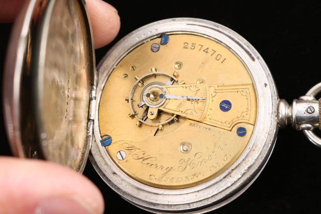 1) Hampden Dueber grade, model 4, 16 size, 17 jewel. The dial of the watch is marked Hampden Watch Co., the movement is engraved with “The Dueber Watch Co.” (which is also the grade). Number 2773180, manufactured 1910. Railroad grade. Dueber Special 25 year gold filled Hunter case. Both sides of the case are etched with a image of a stag with floral motifs. The inner movement cover is engraved in old English "Frank M. Billesbach 1912".In good working order. 2) Waltham Starling grade, model 1877, 8 size, 7 jewel. Number 2574701, Manufactured Dec. 1884-Sept. 1885. Movement marked D. Harry Knerr, Camden N.J. Leader silver/coin hunter case. Both side of the case are etched with floral motifs and the inner movement cover is engraved in script " Frank P. Ross Camden N.J. 1866