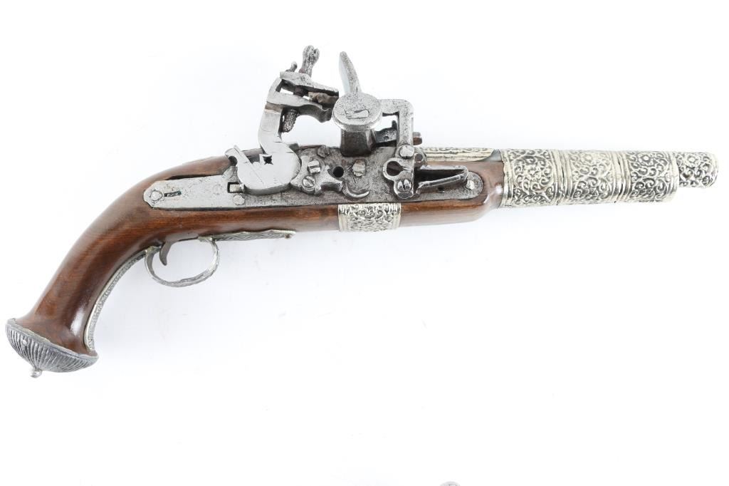 Three Spanish made replica flintlock pistols. Non Operable, for display only. All in very good condition except one is missing a sideplate. Great display pieces, or decor for the bar,