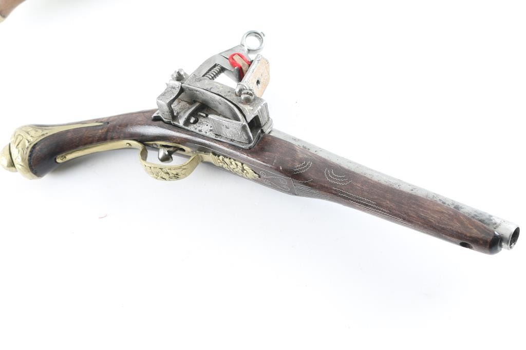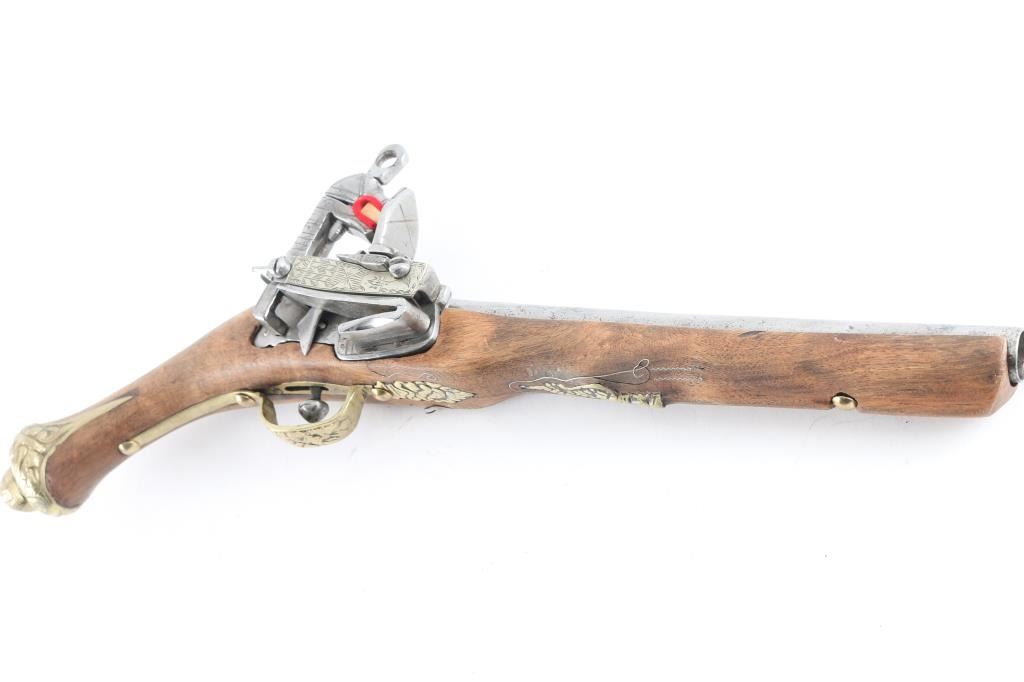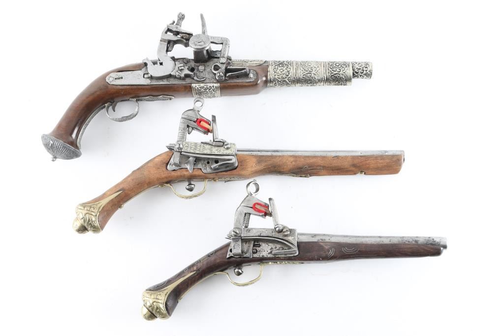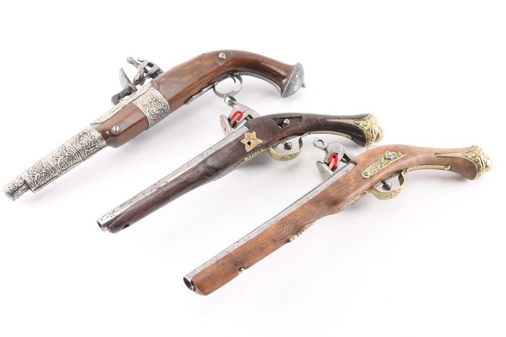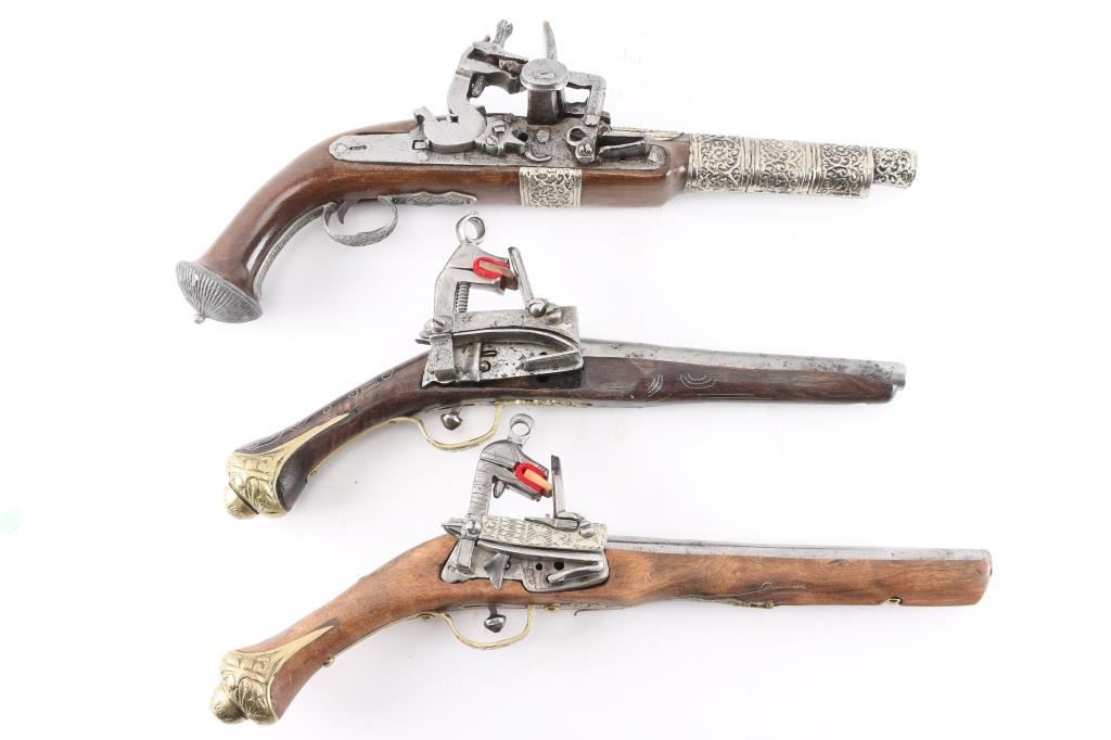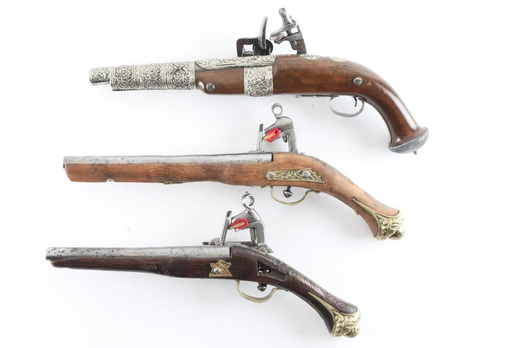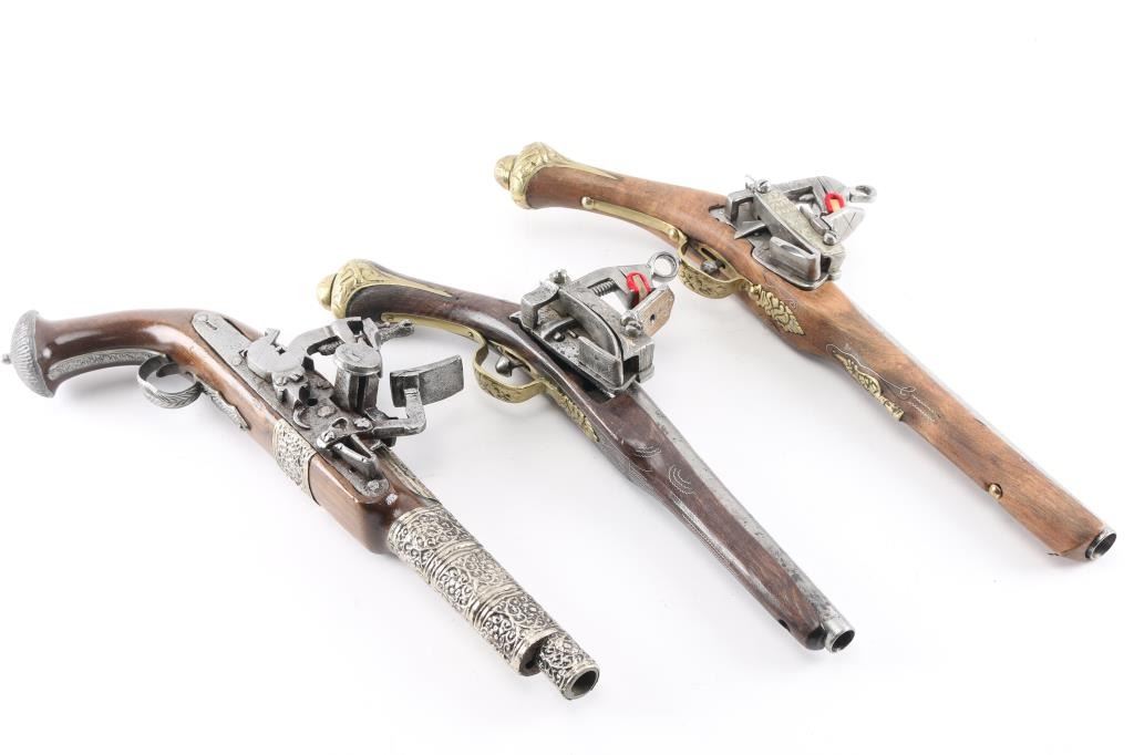 Three Spanish made replica flintlock pistols. Non Operable, for display only. All in very good condition except one is missing a sideplate. Great display pieces, or decor for the bar,