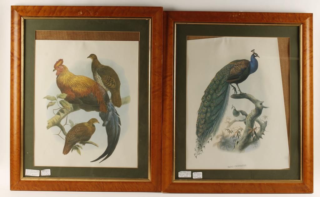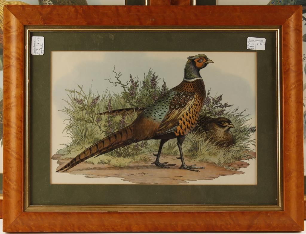 Rooster with two hens (29-3/8" by 24-1/8"), Ring-necked pheasant cock and hen (24-1/2" by 18-1/2"), and peacock and peahen (29-3/8" by 24-1/8"). All frames appear to be birds-eye maple.