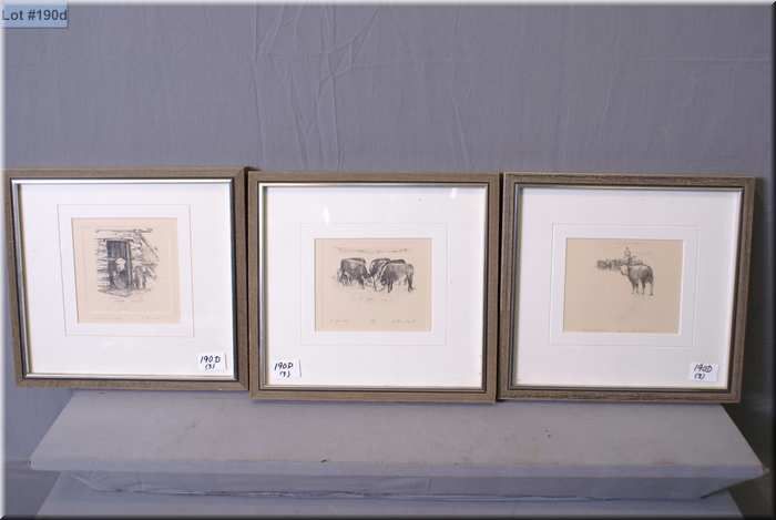 Lot of Three Small Olgo Tomlinson Artist Signed & framed prints : "Log Barn - Cariboo", "The Yearling 8/69", "End of Cattle Drive", black & white