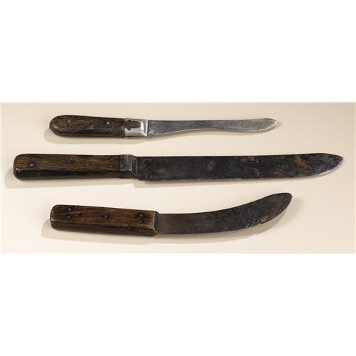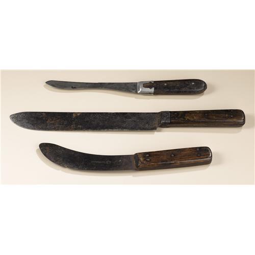 <B>Lot of Three Trade Knives</B></I><BR>Circa 1875<BR>Lengths 10 1/2 in. 15 in. 10 3/4 in.<BR><BR>All have single edge steel blades and are fitted with wood grips. Two knives are stamped on the left face with the maker's name. These knives are typical examples of those used to butcher buffalo in the field.<BR><BR> <BR><BR><B>Important noti