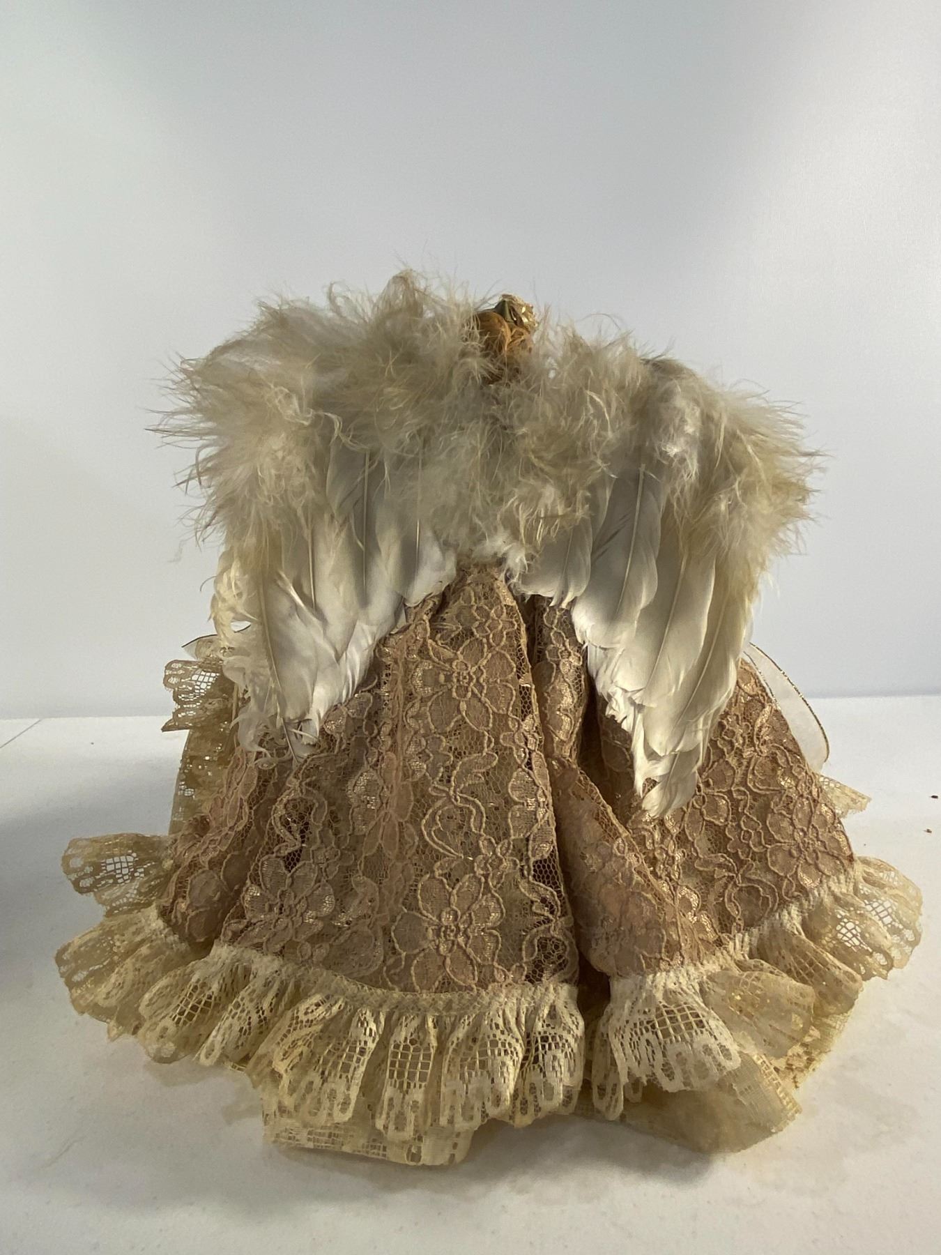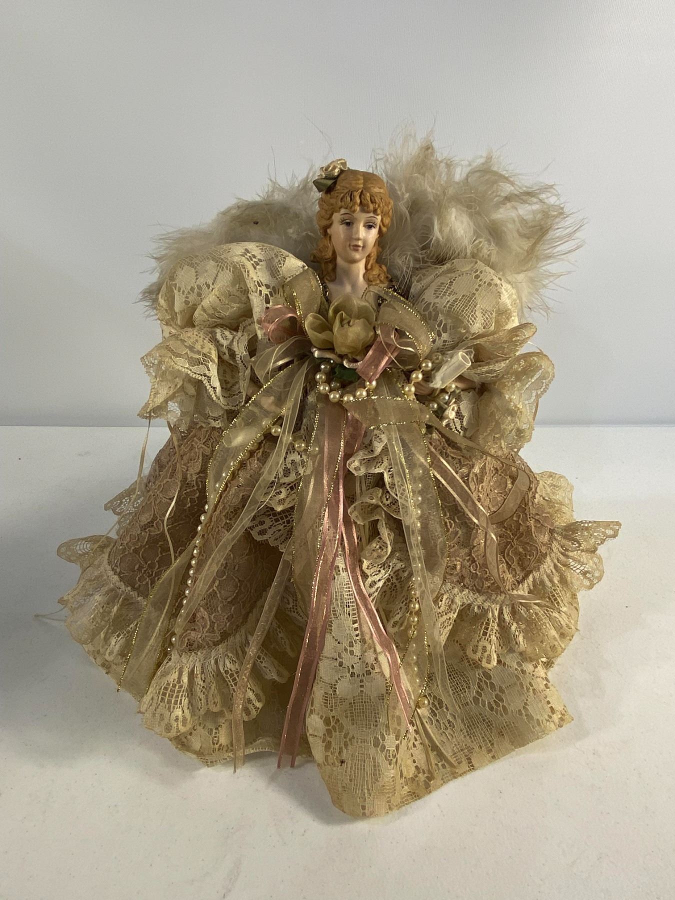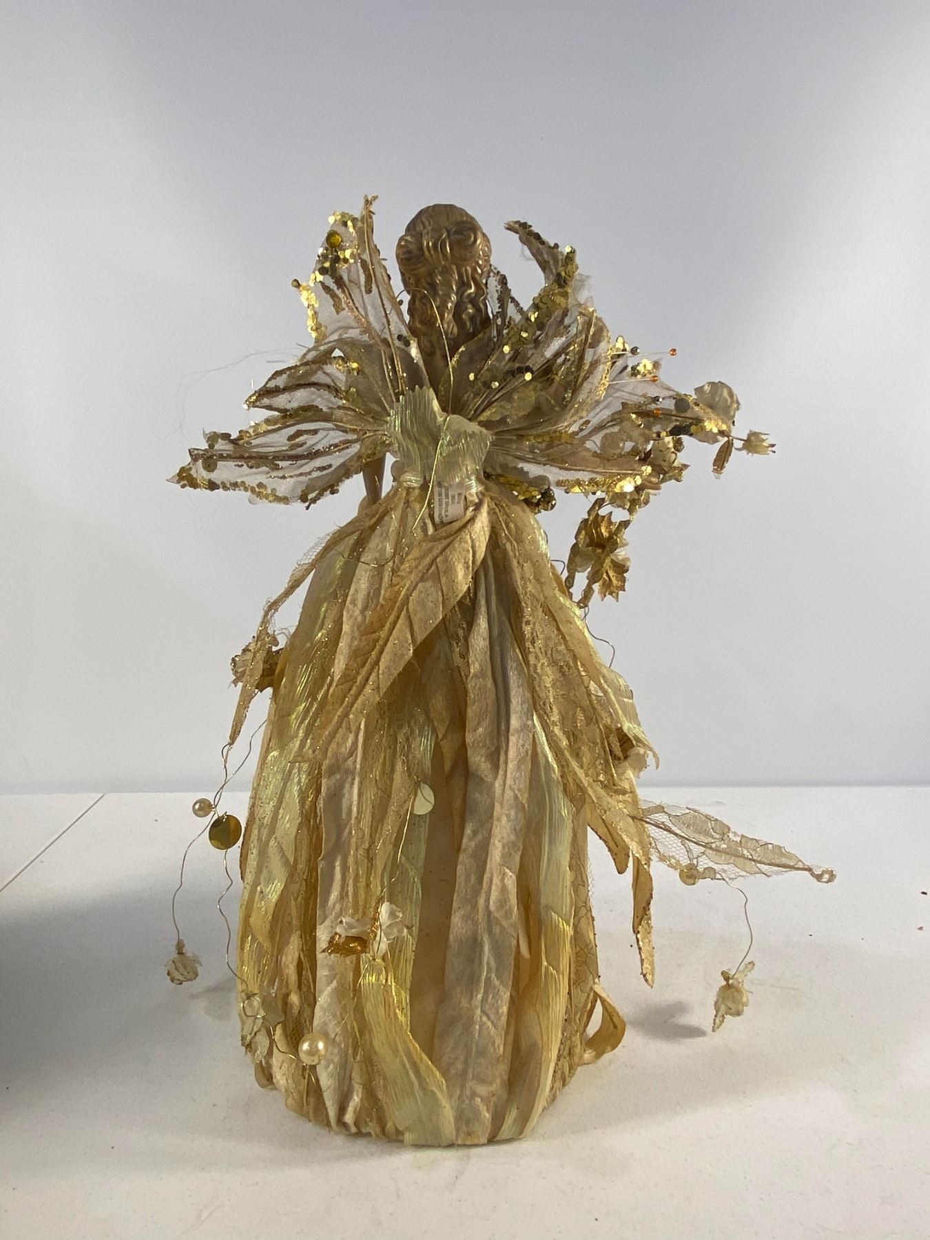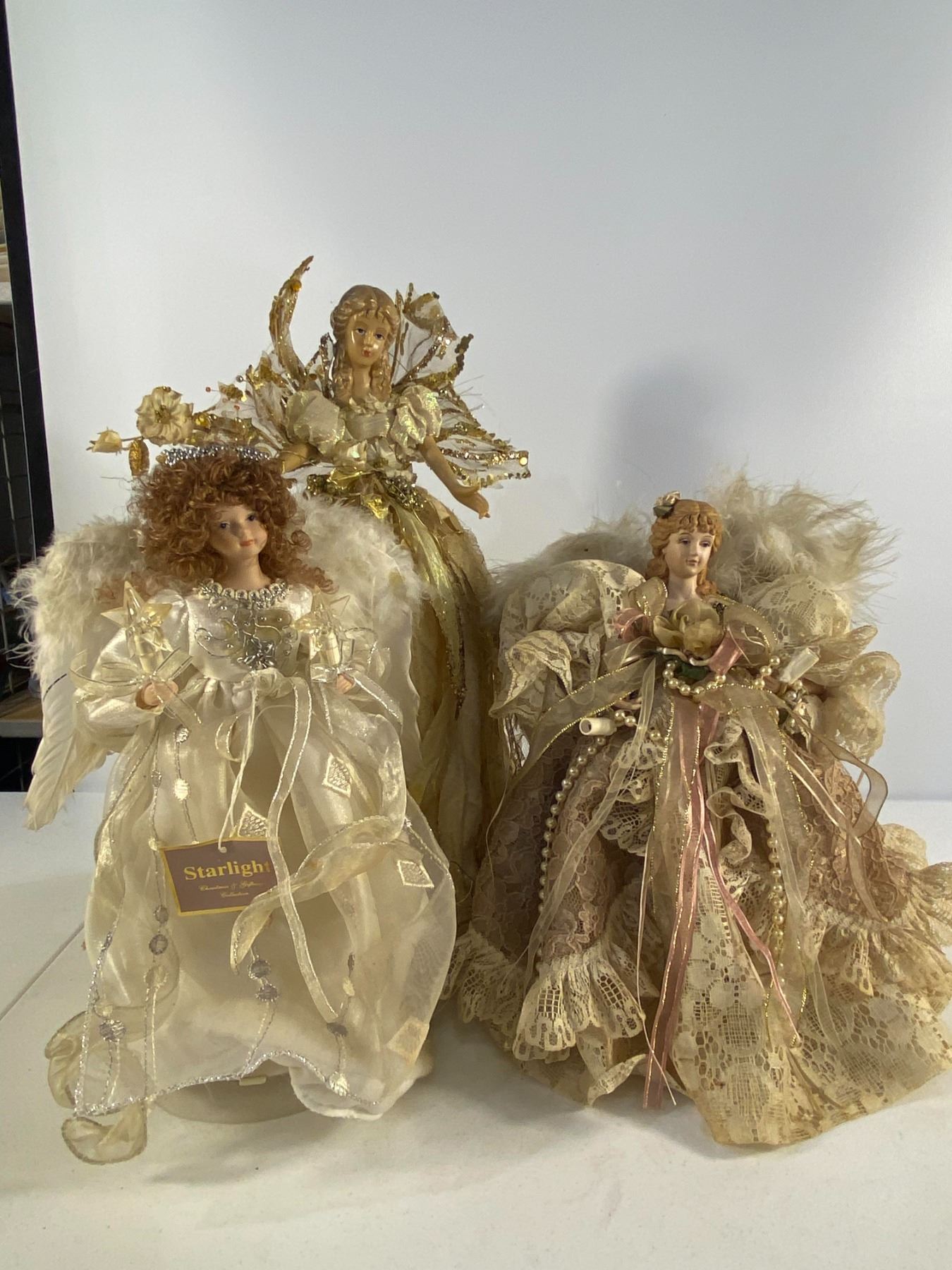 Elegant trio of angel dolls adorned in cream and gold lace gowns, with feathered wings and metallic accents. Approx. 1418" tall Condition: Good; some light fraying and wear.