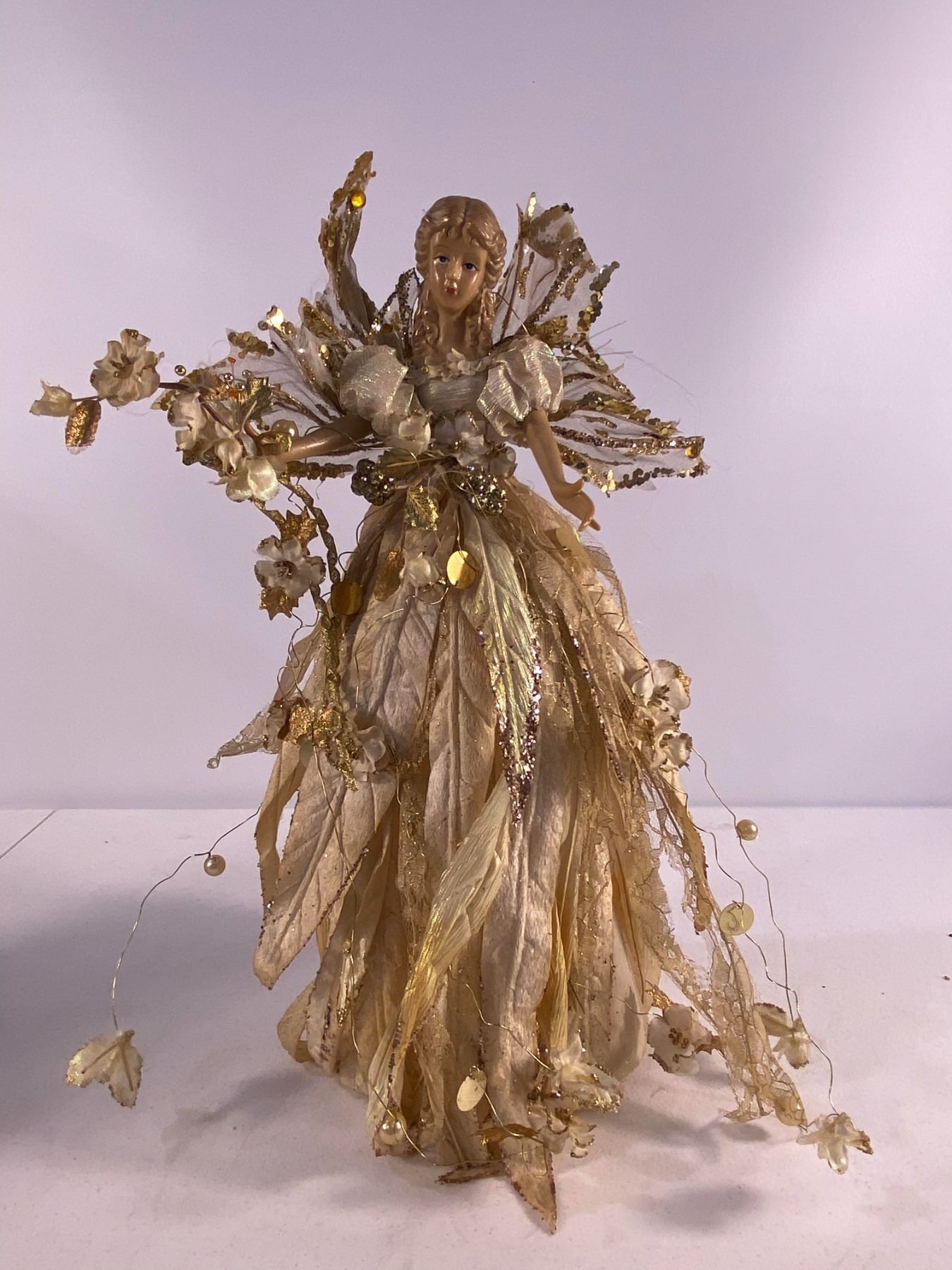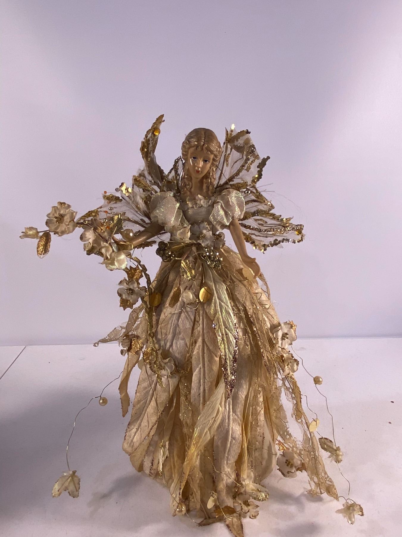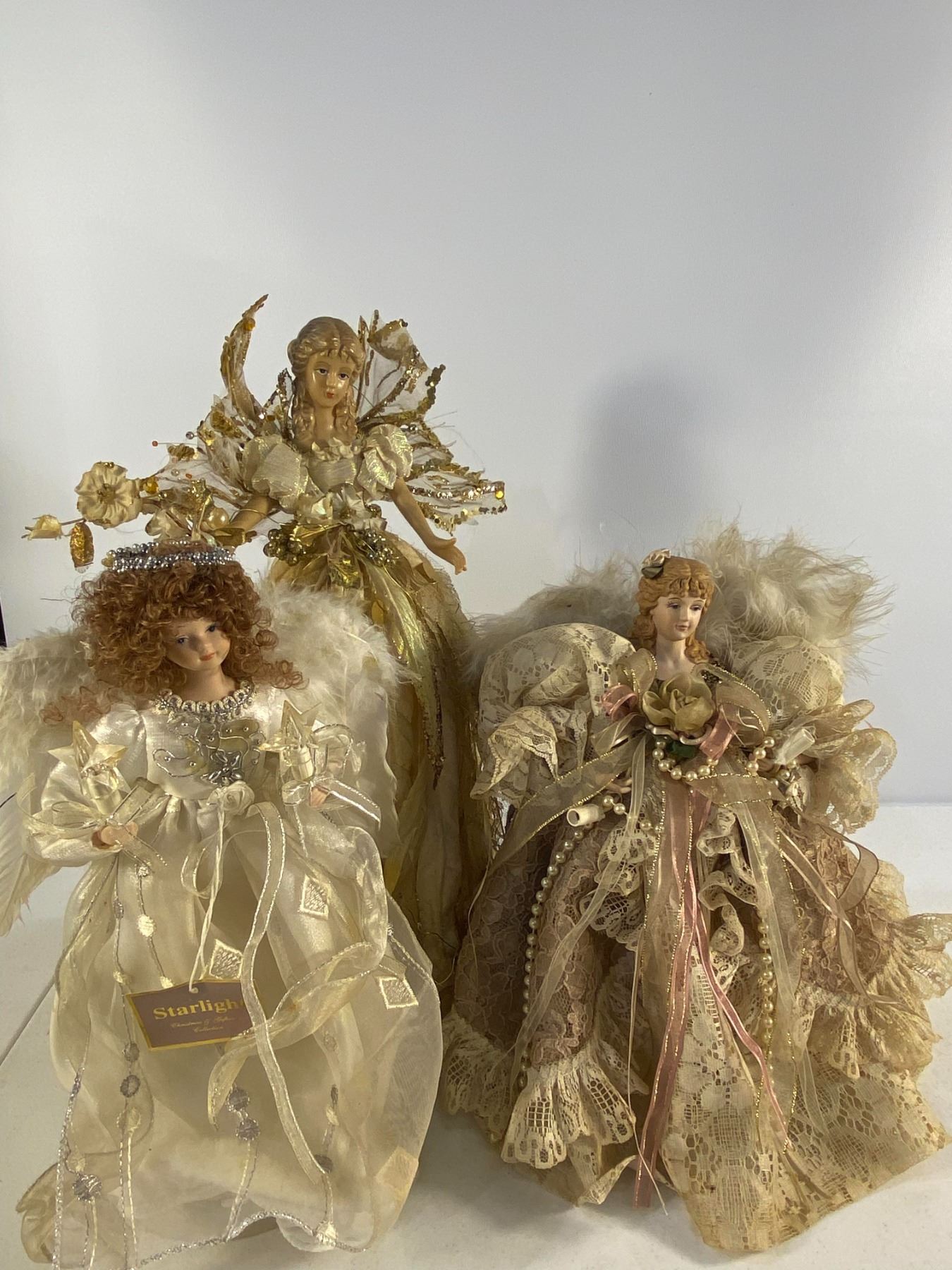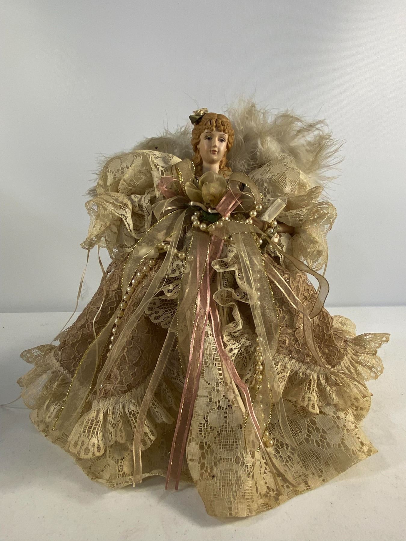 Elegant trio of angel dolls adorned in cream and gold lace gowns, with feathered wings and metallic accents. Approx. 1418" tall Condition: Good; some light fraying and wear.