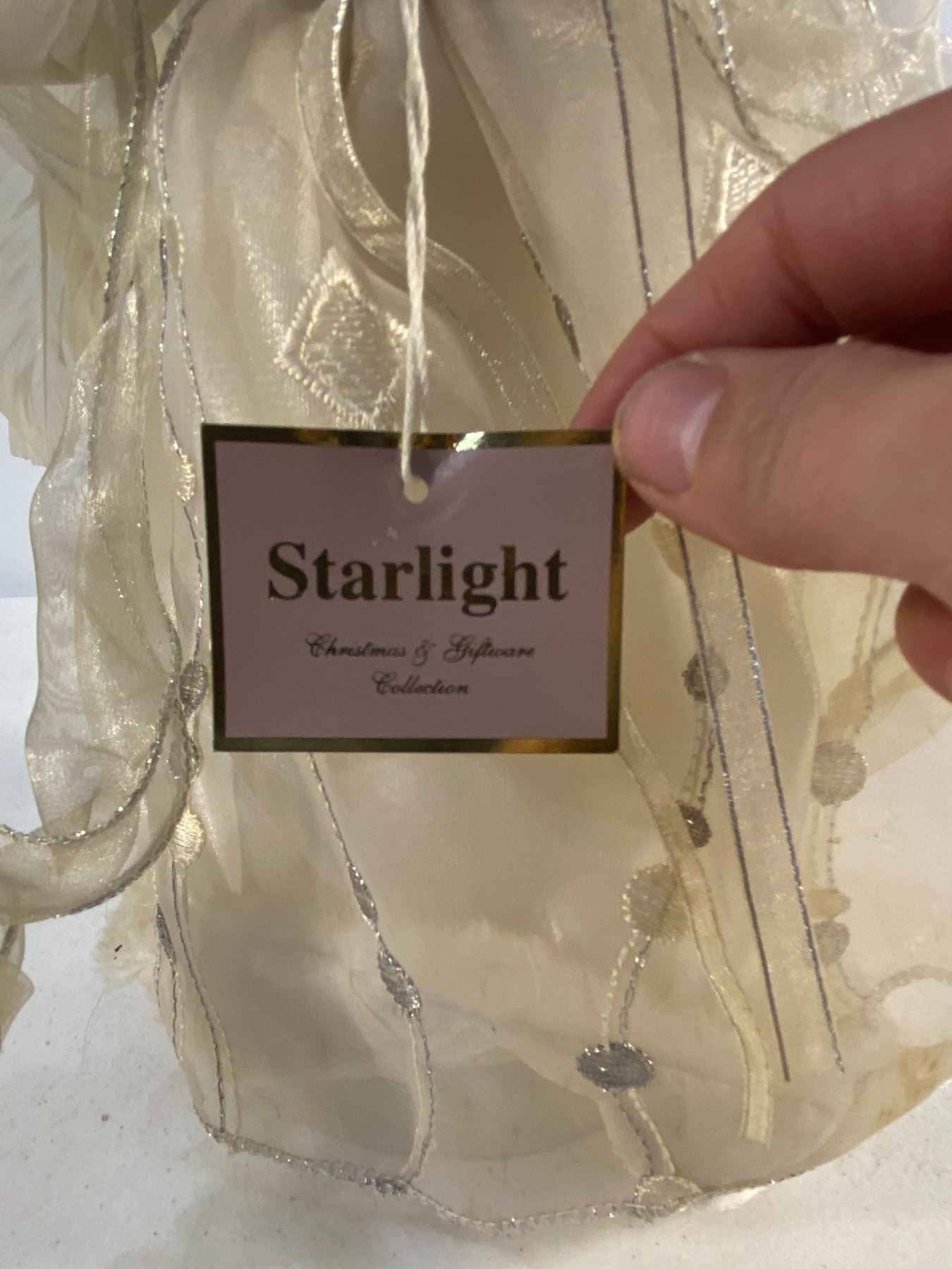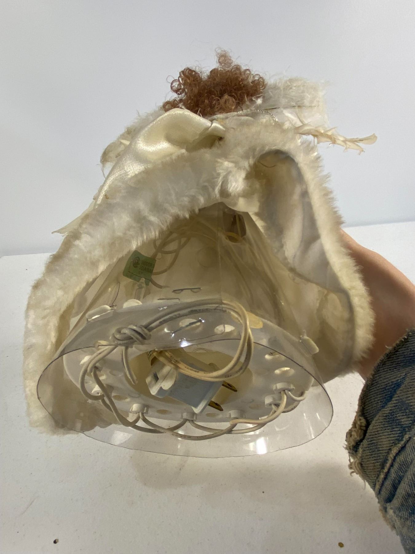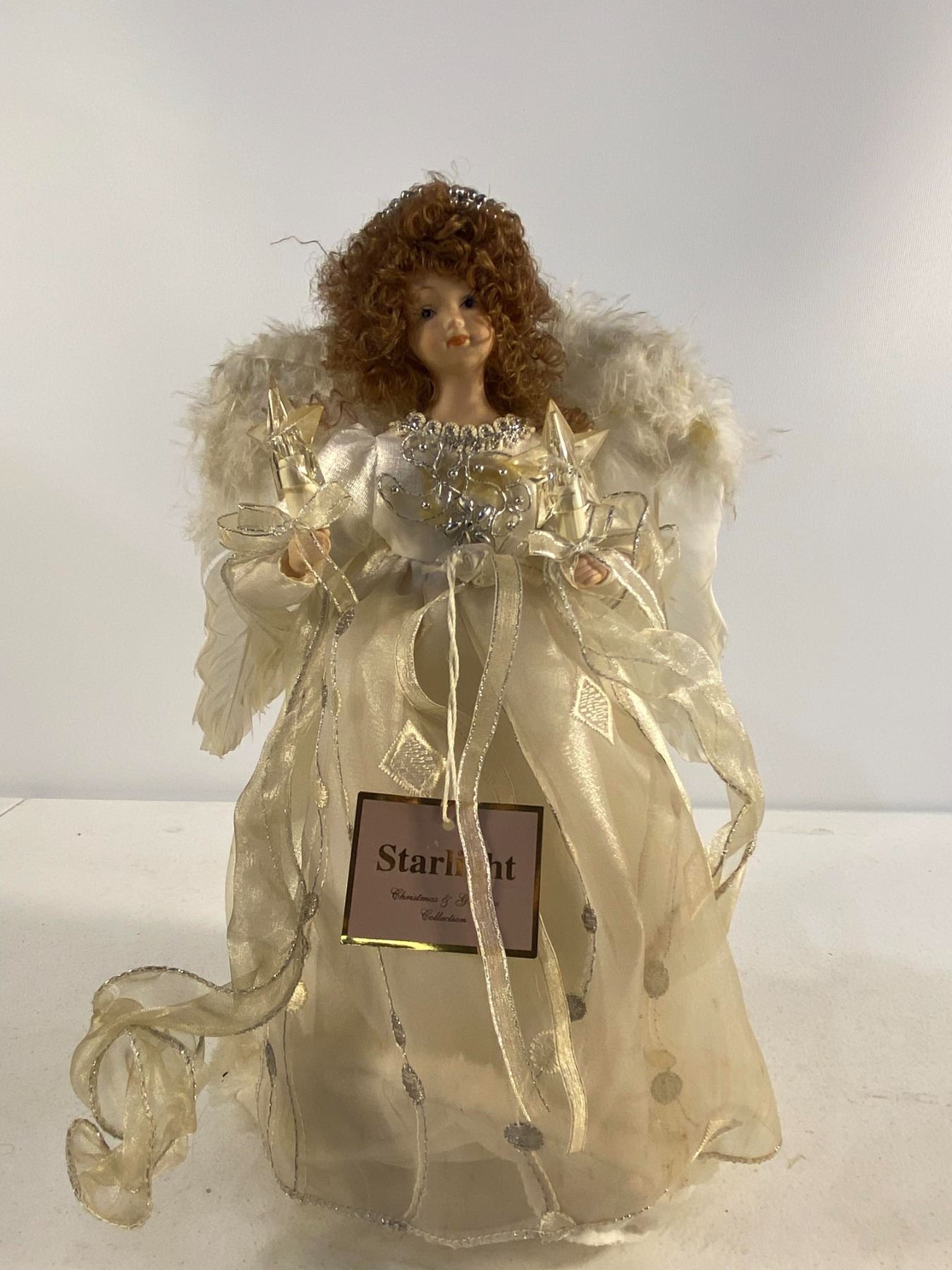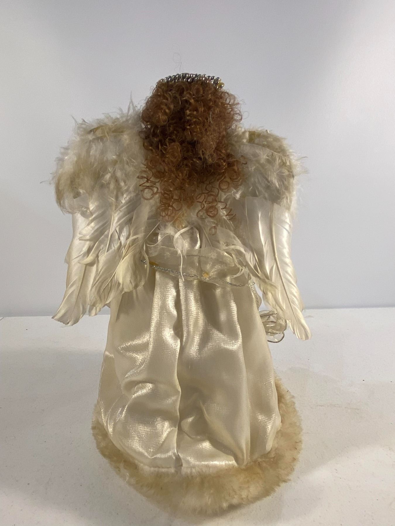 Elegant trio of angel dolls adorned in cream and gold lace gowns, with feathered wings and metallic accents. Approx. 1418" tall Condition: Good; some light fraying and wear.