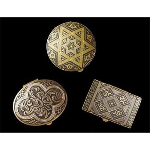 Lot of three vintage miniature pill boxes decorated with a gold tone metal design over a black background. The oval shaped box is marked Spain, the other two are unmarked. In good used condition with signs of wear as shown. Shipping them anywhere in the USA will cost USD$10.