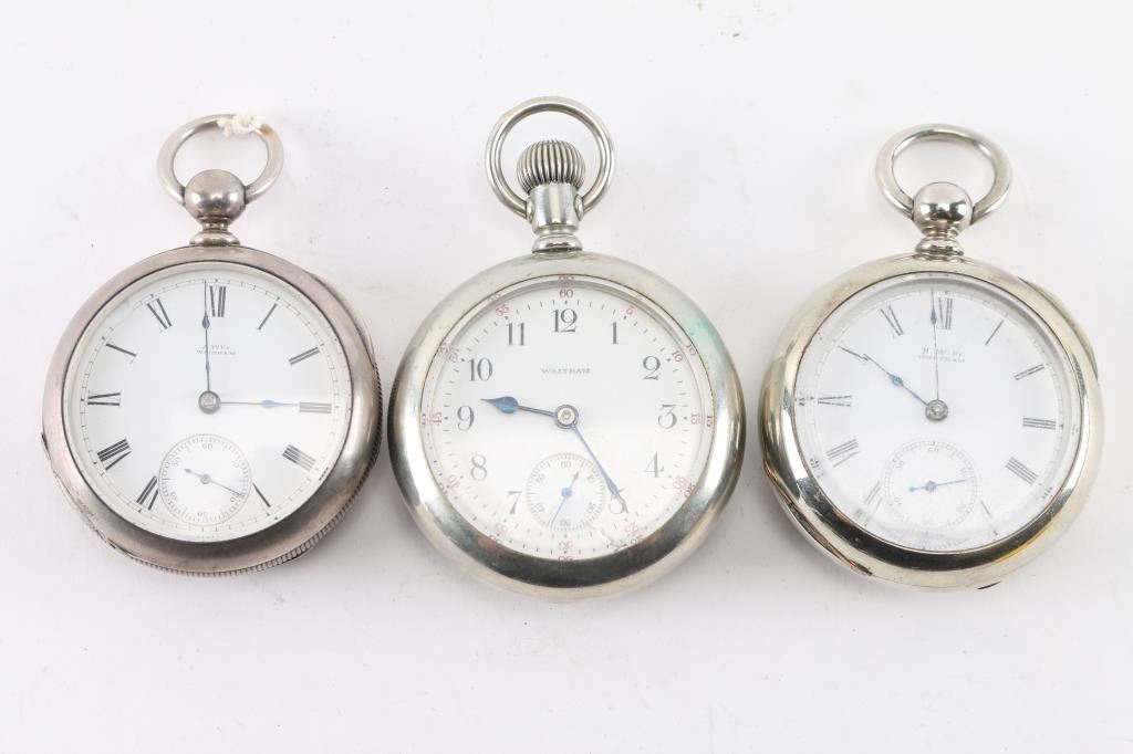 1) Waltham Wm. Ellery grade model 1879, 18 size, 11 Jewel. Number 2381617. manufactured 1884. Key movement setting. (No key). Fahy's silver/coin case. In good working order. 2) Waltham Broadway grade model 1883, 18 size, 7 jewel. Number 4907994, manufactured 1891. Key movement setting, (No key). Silveroid case. In good working order. 3) Waltham No. 18 grade model 1883, 18 size, 7 jewel. Number 21220617, manufactured 1917, Philadelphia silverode case. Image od steam locomotive on back of case. In good working order.