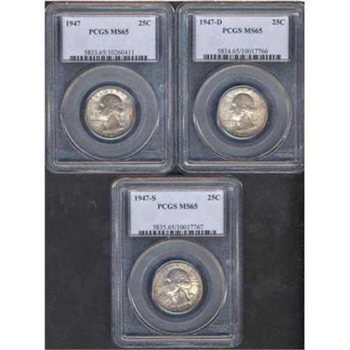 <b>Lot of Three Washington Quarter Dollars.</b> PDS Set includes: 1947 PCGS MS65, 1947-D PCGS MS65, and 1947-S PCGS MS65. Lot of 3 coins. <i>