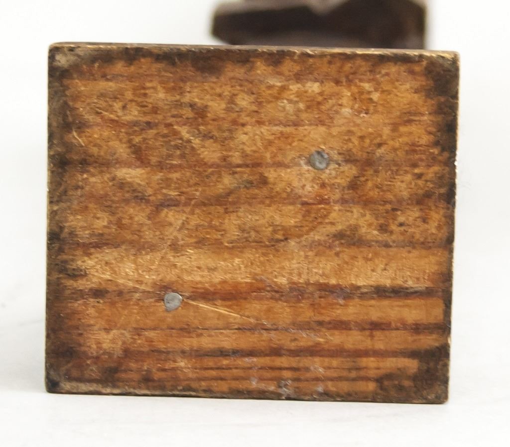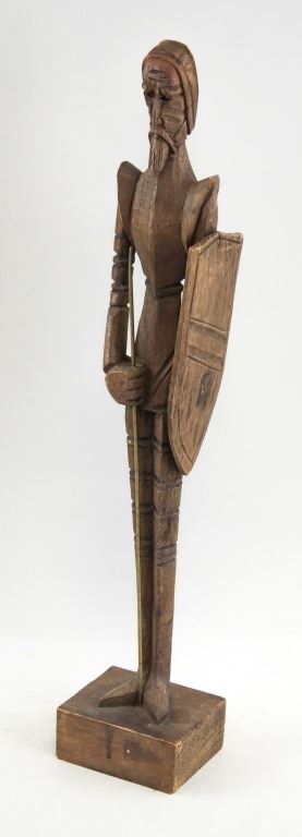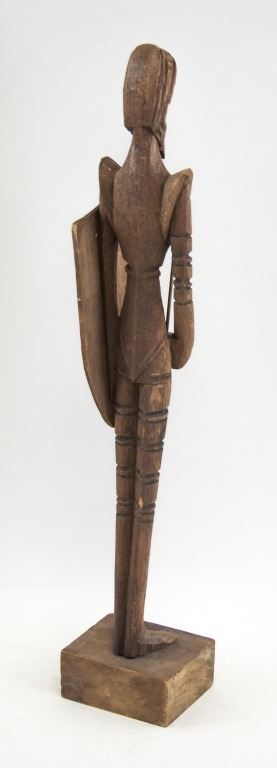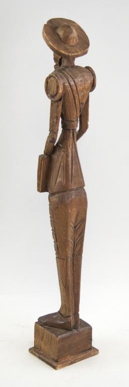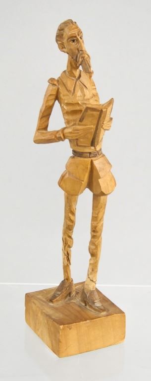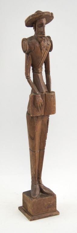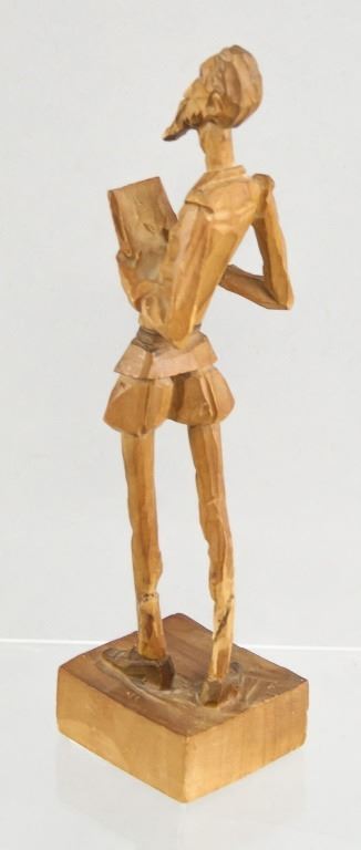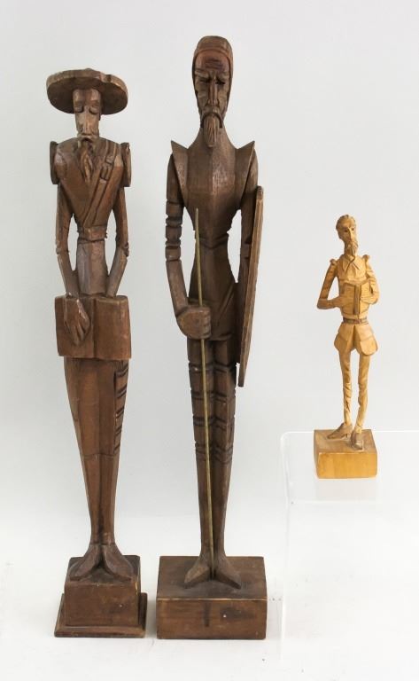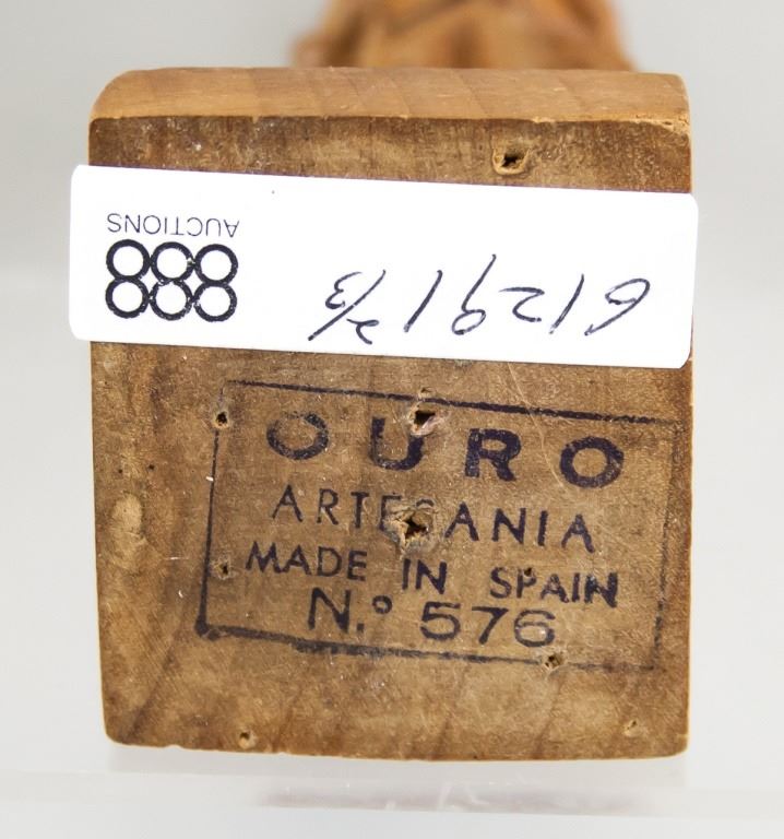 Three wood-carved statues. One of honey yellow tone, the other two of deep brown tone. With elongated figures. "OURO / ARTESANIA / MADE IN SPAIN . No 576" stamped on base of one figure. 45 x 8 cm, 455 grams.