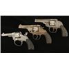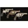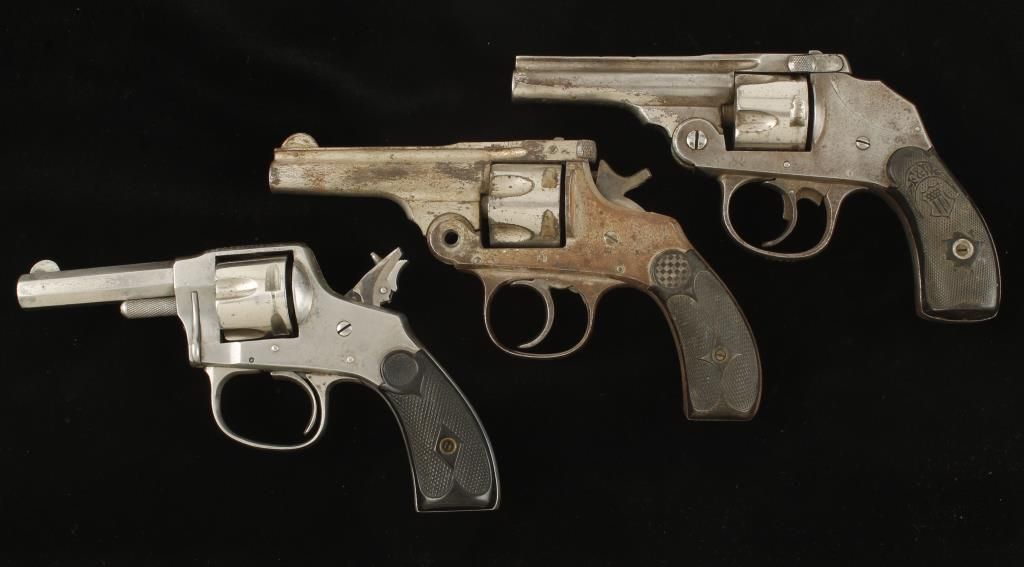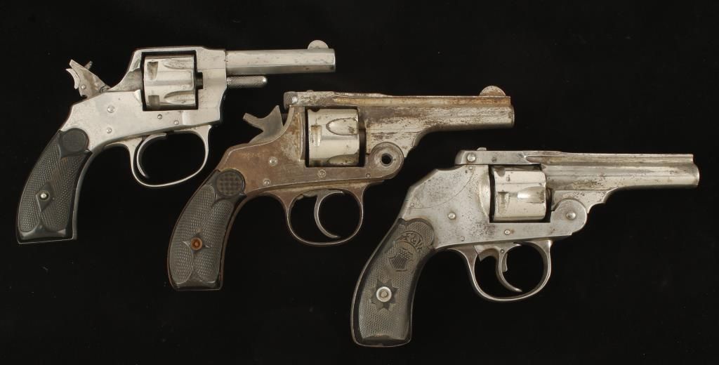 One Hopkins & Allen marked "X.L.S.Double Action .32 Cal Centre Fire" This has a folding spur on the hammer to allow for single action fire. Finish is fair. Next is a H&A missing the top break pin and mainspring. Finish is poor. Last is an Iver Johnson hammerless with Forehand & Wadsworth grips. This has no mainspring and the cylinder spins freely. Finish is poor. Overall condition for the 3 is poor. *Antique Firearms*