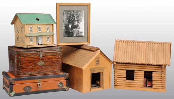 Description Includes one wooden church, one wooden cabin, wooden animals, and two tin chests. Lot also includes a photograph of a young boy sitting in front of a Christmas tree next to a toy stove, train set, and cow platform toy. All items show moderate wear and use. Condition (Very Good). Size Tin Chests: 10" L.