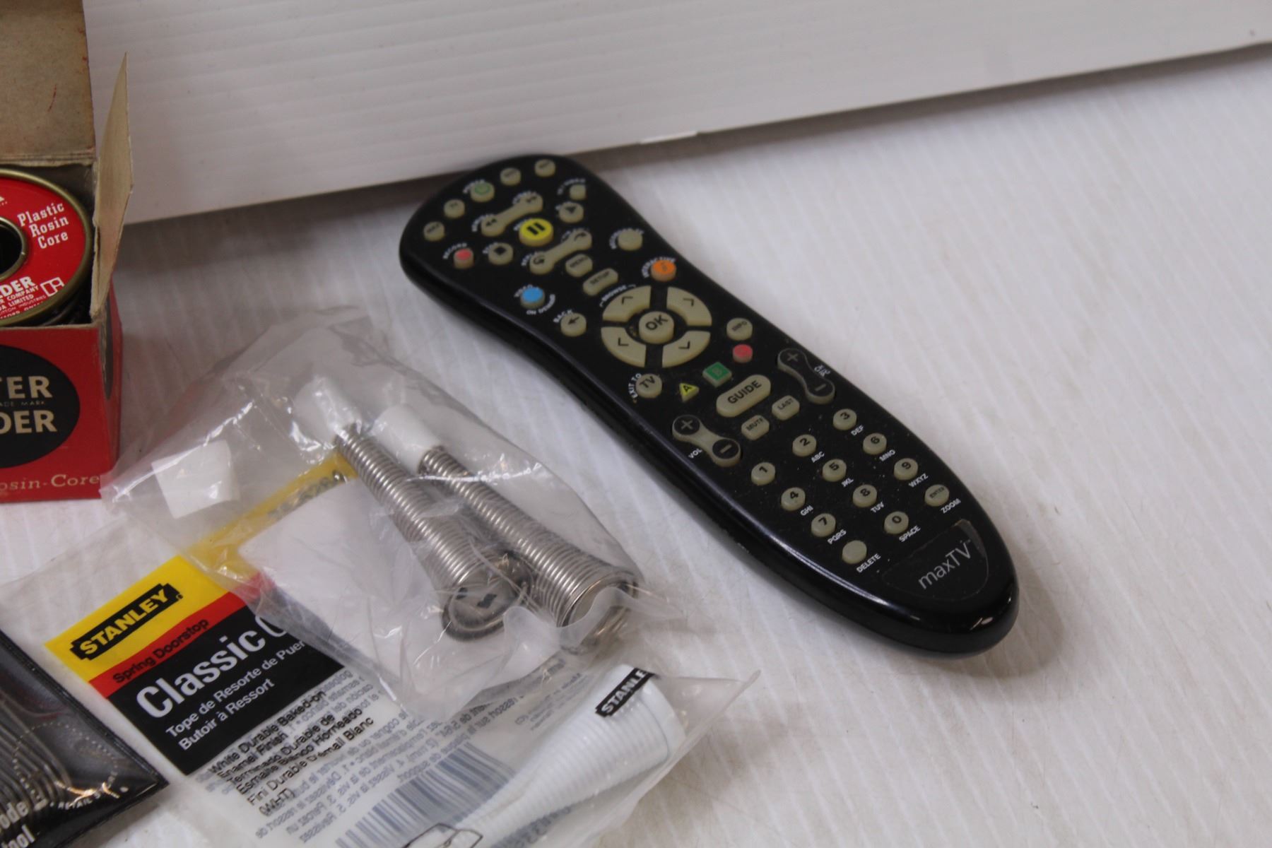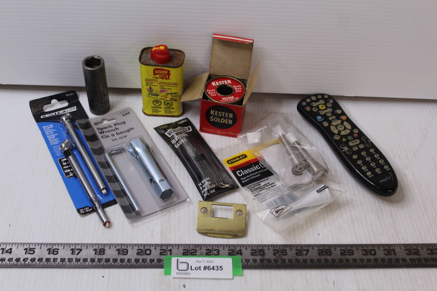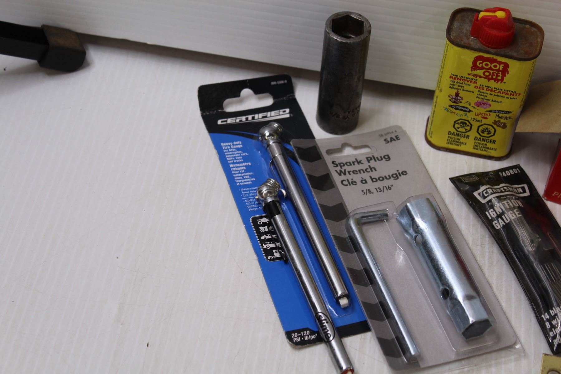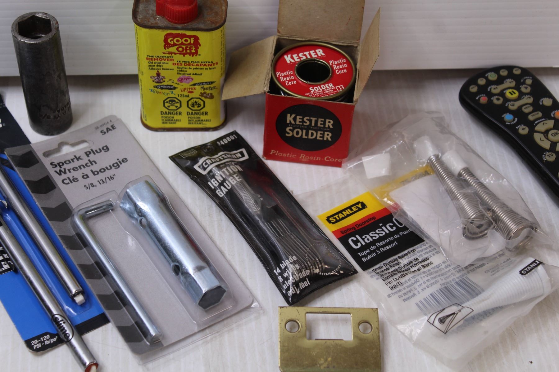 Lot of: Tire Gauges(2), Spark Plug Wrench, Ignition Gauge Set, Solder Wire, Goo Off, (3) Door Stoppers, Remote
