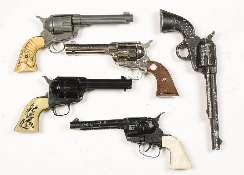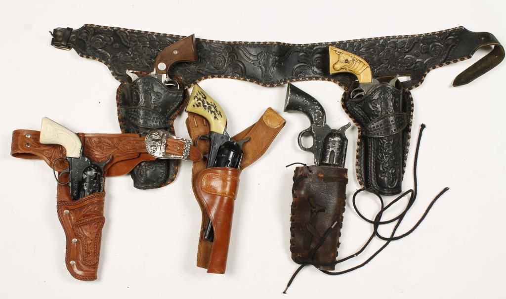 One is in a spring clip shoulder holster. 2 are in a heavily tooled double rig. 1 is in s plastic single rig. The last is in a homemade leather holster.