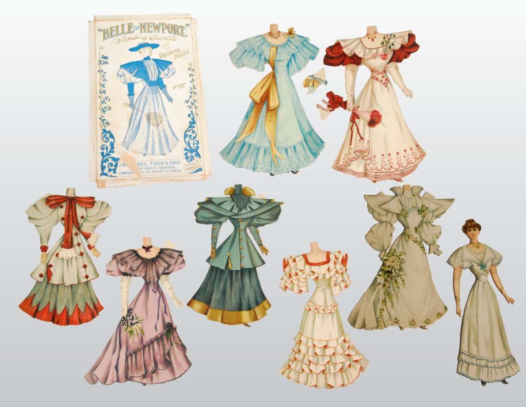 Description Circa 1890s. The four 9-inch ladies include: "Belle of Newport", complete with four gowns, and four hats. "Belle of Saratoga", "Belle of the South" and "Belle of the West" are not complete and have wear, flaws and damage. The cardboard folders are in fair condition.