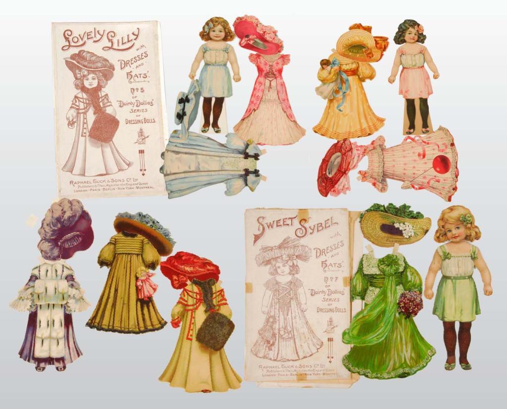 Description Circa 1890s. Three pretty 9.5-inch dolls include: "Lovely Lilly", four outfits, four hats and a box; "Sweet Sybel", four outfits, three hats and a broken cardboard folder; "Fair Frances", four outfits and four hats. There is no doll for "Gently Gladys", only the clothing. This lot is graded from fair to fine.
