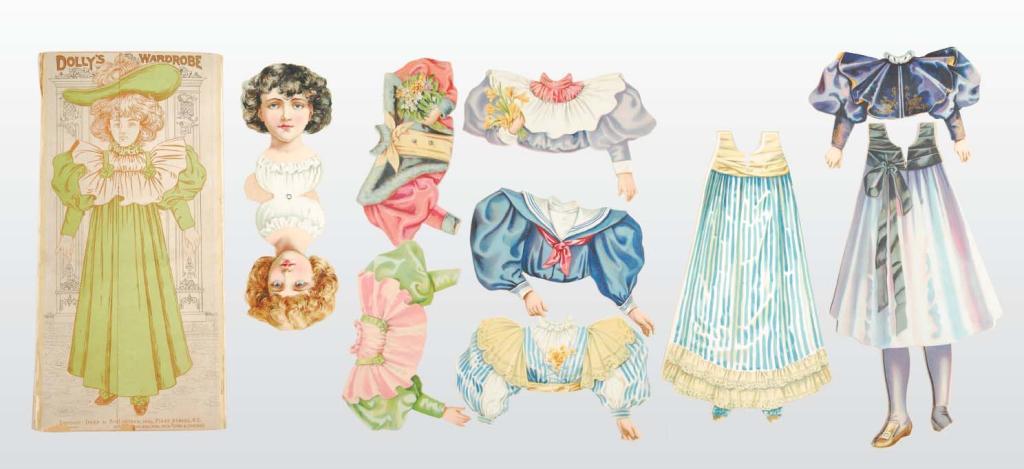 Description ND. Published by the famous Dean Company, Dolly's heavy cardboard folder protects an ingenious paper doll. The heads and clothing are in front and back sections and can be put together to create a variety of dolls and outfits. One foot is missing at the ankle; another is breaking and the folder has damage. Despite the flaws, this is a unique set in fine condition.
